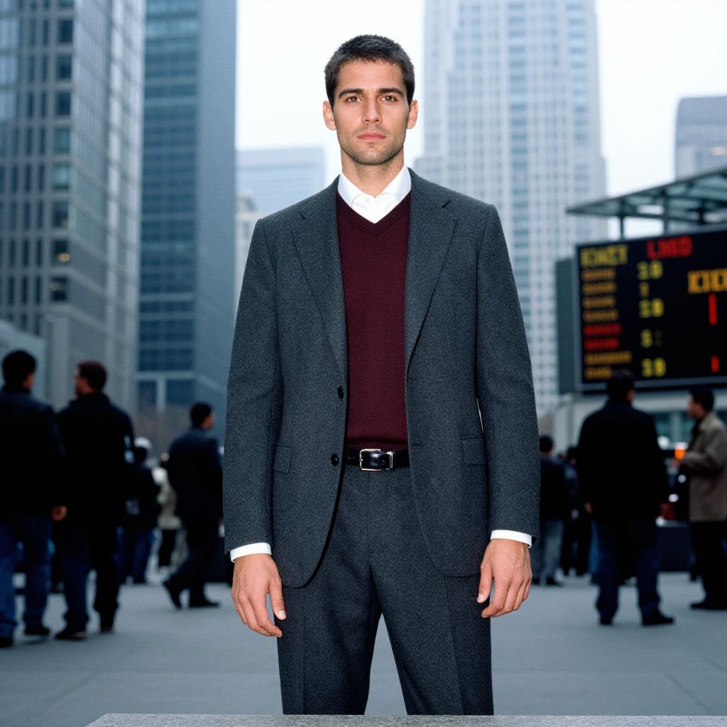 A man, charcoal gray tailored suit, burgundy V-neck merino wool sweater, crisp white dress shirt, black leather brogues, sleek black leather belt, glass skyscrapers, bustling traders, digital tickers flashing, kodachrome analog film, confident expression. Man has masculine face and piercing eyes
