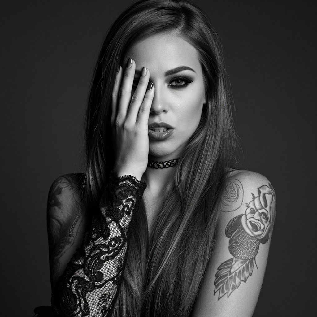 This is a black-and-white photograph of a tattooed woman with long, straight hair, partially covering her face with her right hand. She's wearing a lace sleeve on her left arm and a choker necklace. Her expression is intense, with a slight pout, and the background is a solid, dark gray. The image has a high-contrast, dramatic feel.