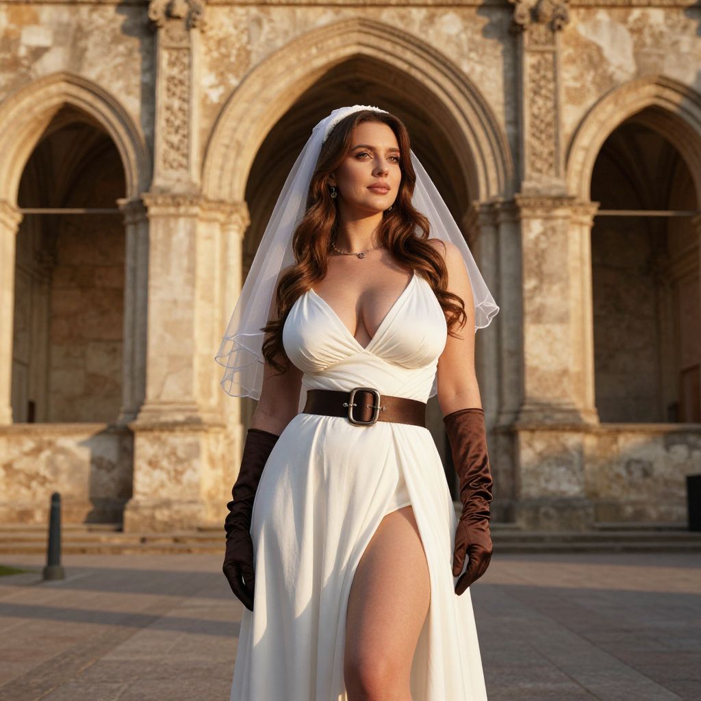 A sexy woman with long brown hair, big tits, and a voluptuous figure is wearing a white dress with a white veil and a brown belt. She has elegant brown gloves on her hands and stands confidently in front of a grand, ancient building with towering arches and a weathered stone facade. The setting is softly lit by golden hour sunlight, casting long shadows and highlighting her graceful posture. Her expression is serene yet alluring, exuding charm and mystery. The atmosphere is romantic and cinematic, with a touch of fantasy and elegance.