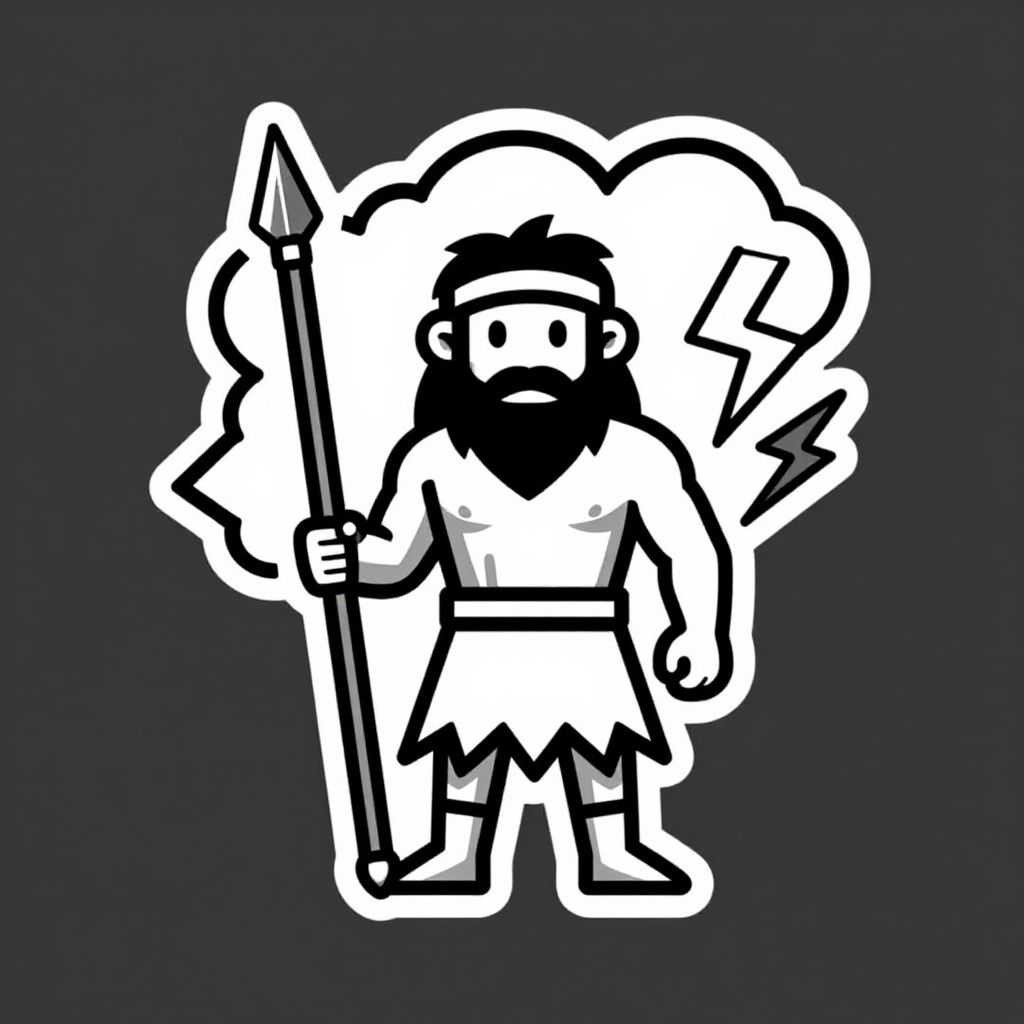 Portraiture one layer, vector business logo, black and white, caveman with spear, cloud with lightning bolts behind him,