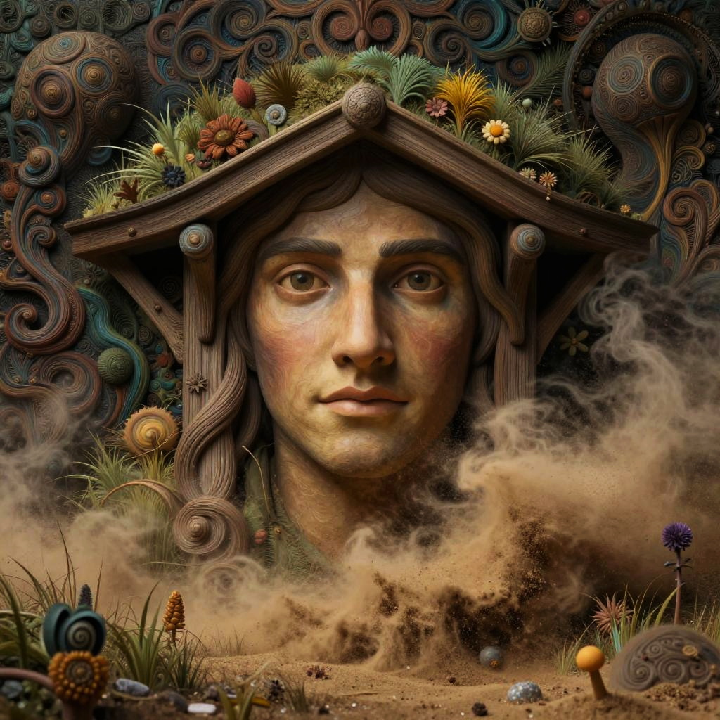 An abstract portrait of a crystal fairy, crafted from fractal magic, where captivating elements coalesce to form a lasting impression, only to dissolve into a swirling sandstorm cloud, evoking a poignant sense of transience. The artwork should be surrounded by intricate, chaotic patterns and feature insane, intricate details. The colors should be high-depth and swirl harmoniously, creating an ethereal ambiance. The final piece should be a masterpiece in 8k resolution, with excellent contrast and ultra-detailed artistry