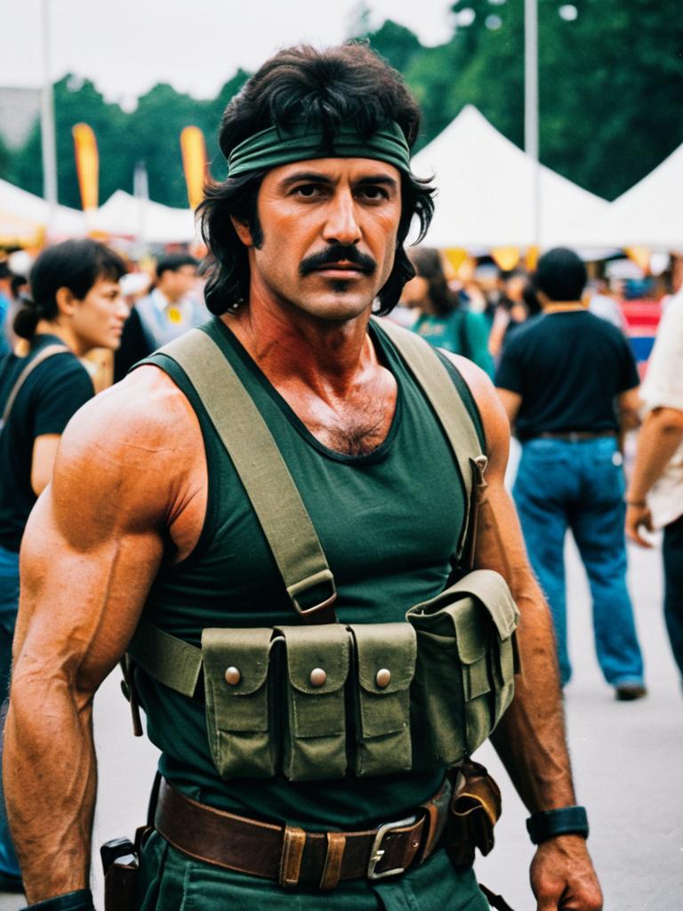 Man in Rambo First Blood costume, candid portrait at cosplay festival