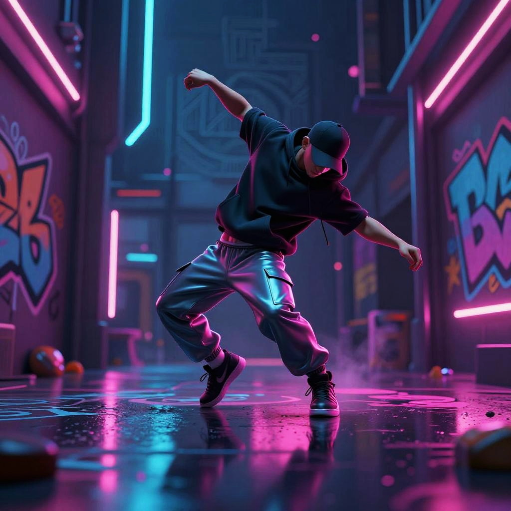 3D digital street dancer, rendered in a futuristic neon theme within graffiti-covered neon alley with infinite reflections, glowing edges and dynamic reflections, dark abstract background with subtle geometric patterns, high-poly hard-surface detail, calibrated color grading, volumetric fog, rim lighting, soft bloom, global illumination, ambient occlusion, reflective wet floor, ultra sharp microdetail, octane/unreal look, accented by electric pink and cyan blue, depth of field, noise-free finish