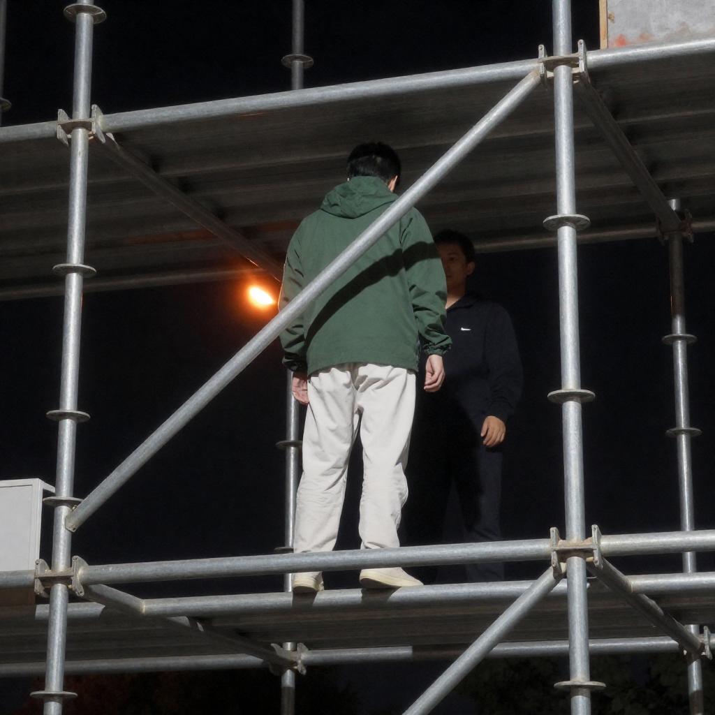 Green-Jacketed Figure on Night Scaffolding