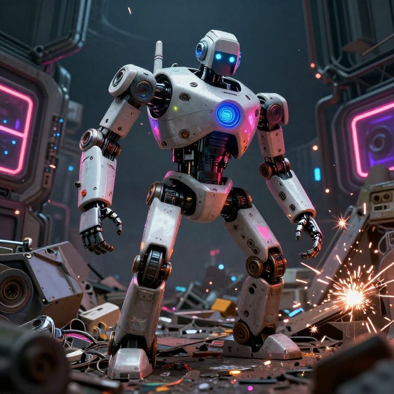 Lopsided robot with uneven limbs standing in a futuristic junkyard, neon reflections and sparks flying, gritty cyberpunk environment with high-tech debris, dynamic composition with bold contrast and detailed textures