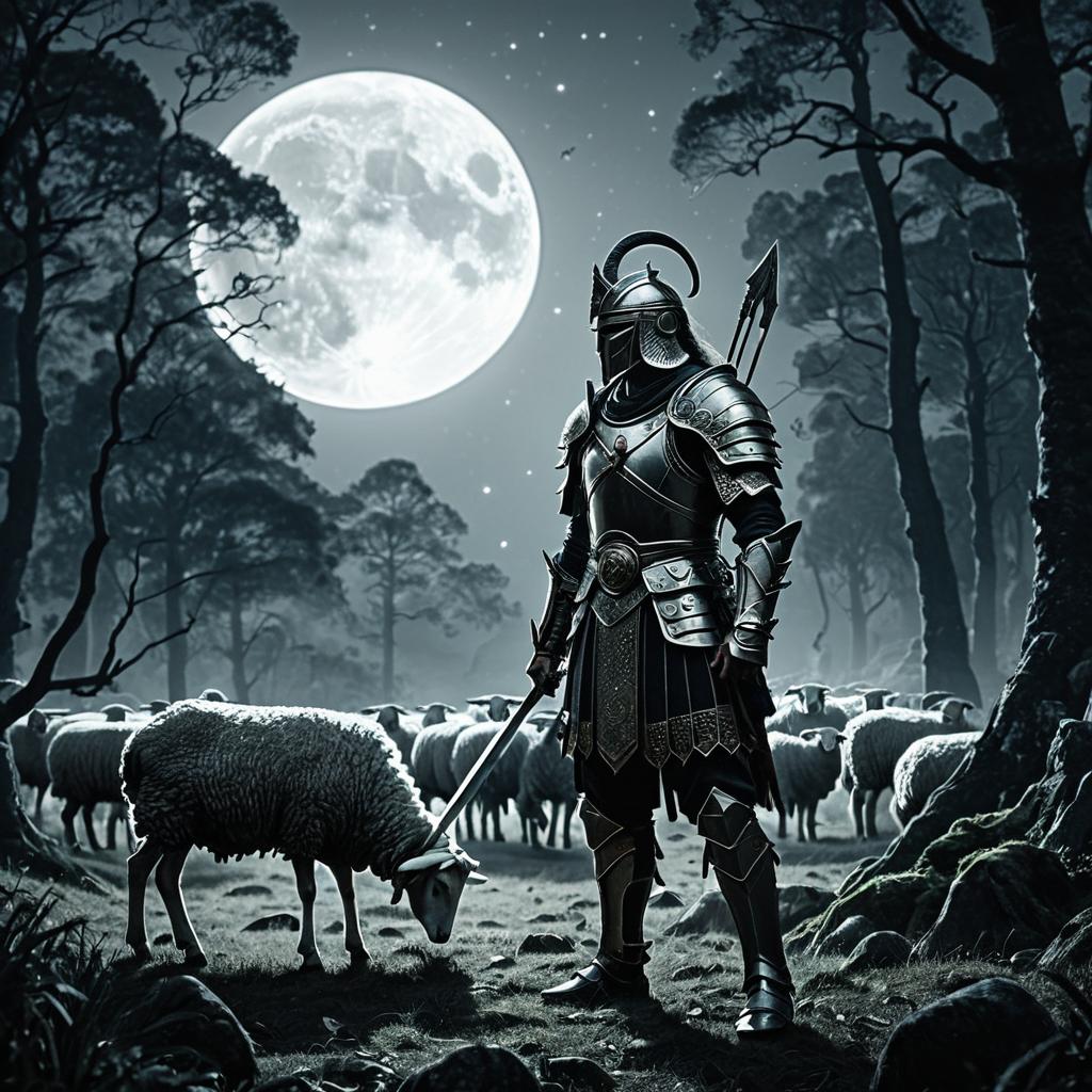 An ancient warrior wearing detailed ceremonial armor stands in an enchanted forest at night. The scene features a silver full moon illuminating the surroundings, revealing ghostly sheep silhouettes. This ultra-intricate fantasy digital matte painting showcases cinematic lighting and sharp focus, inspired by the artistic styles of John Howe and Adrienne Surprenant.