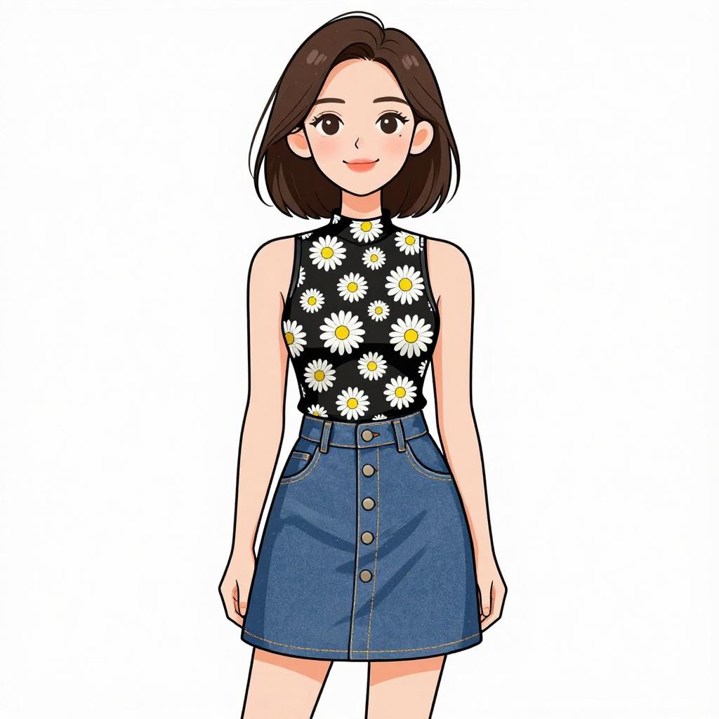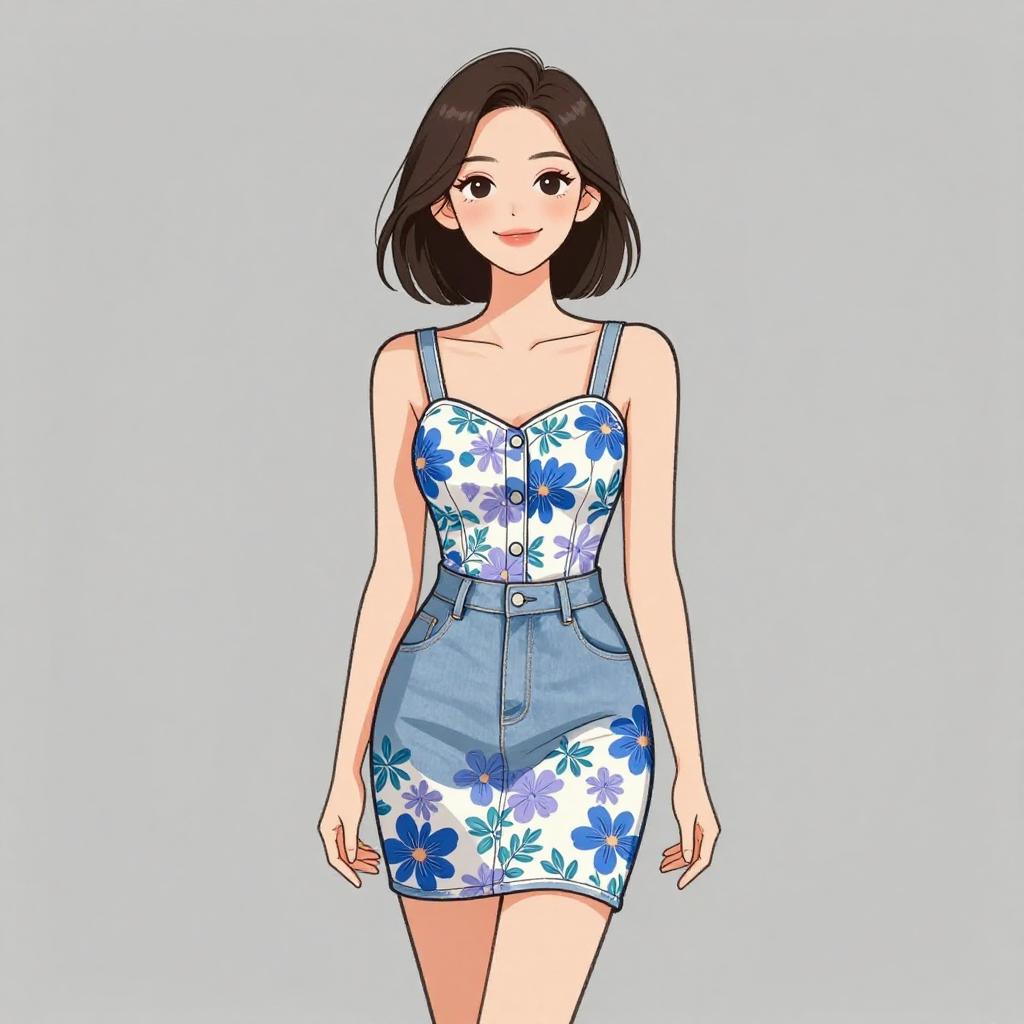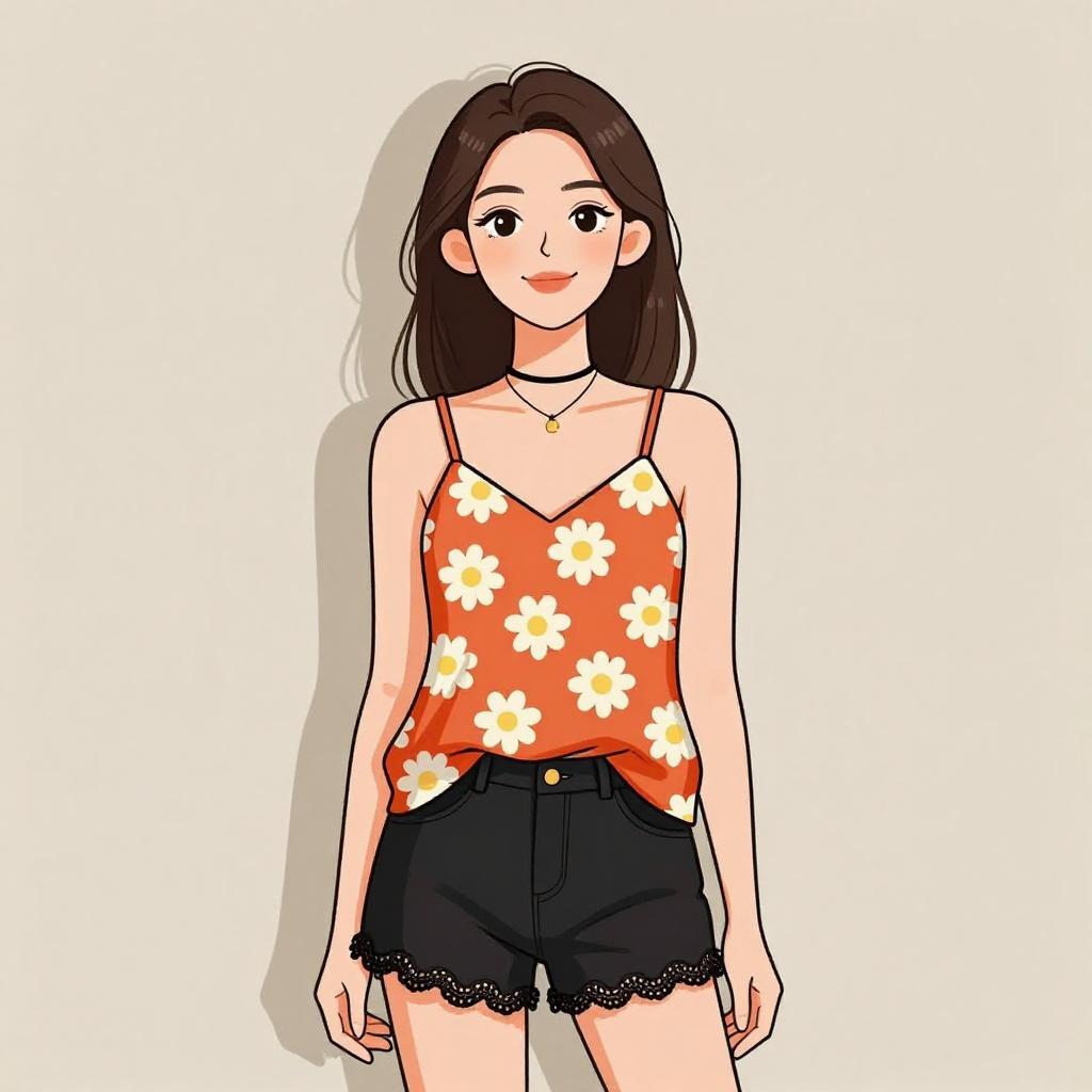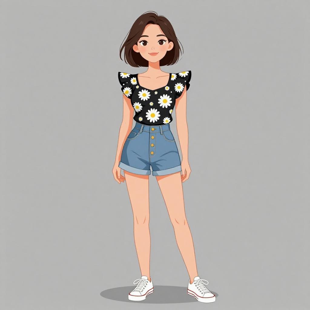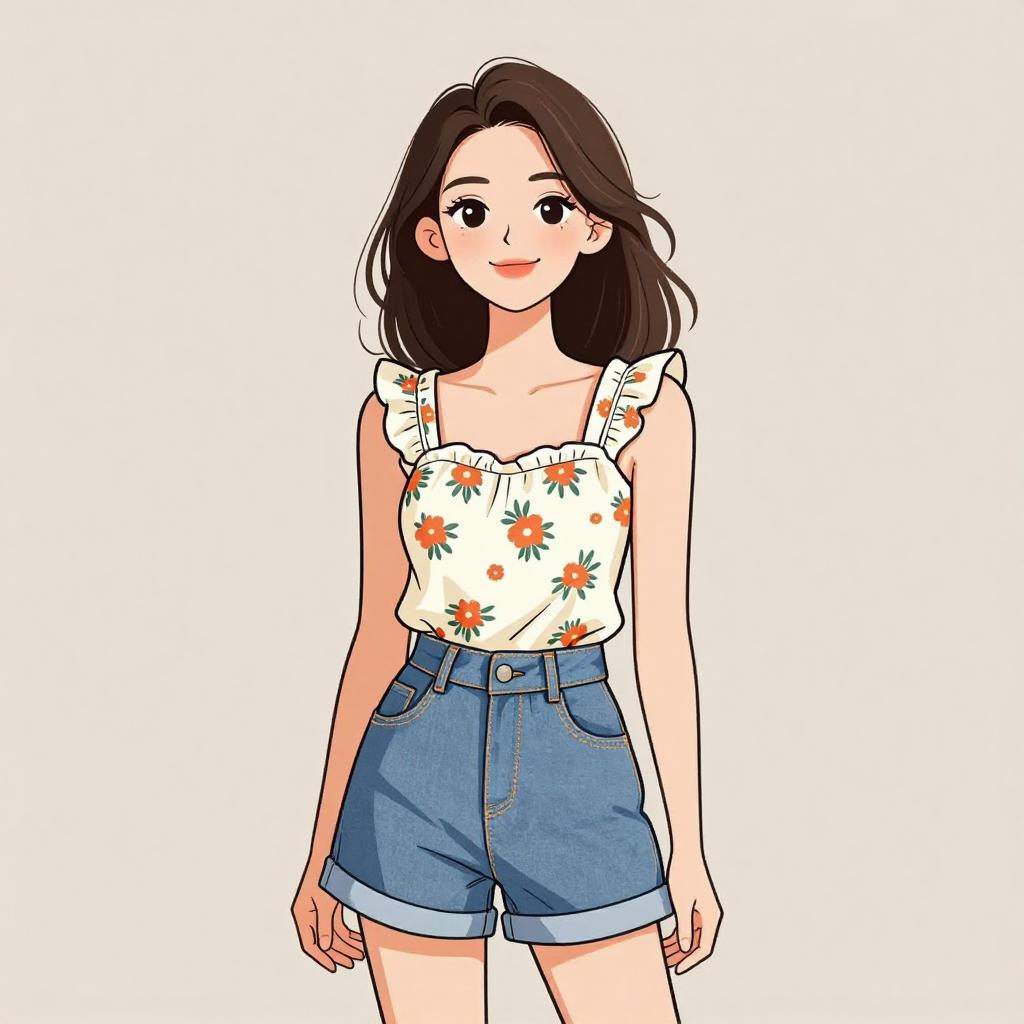 Woman with pretty face and pretty hair. smiling Woman, casual summer, white spaghetti strap crop top with colorful floral embroidery, matching high-waisted shorts with a similar floral pattern, photo studio background --sref 1467