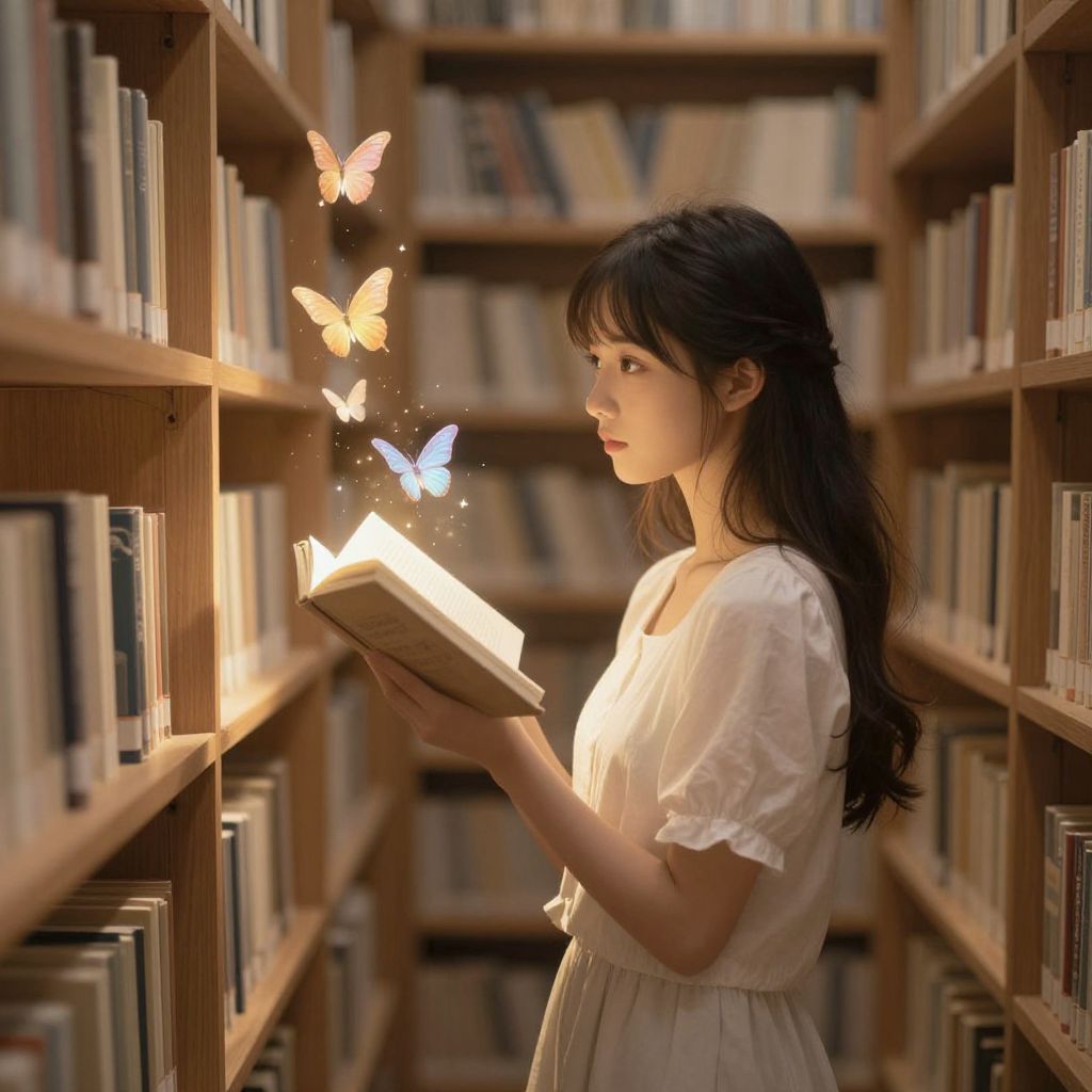 In a serene library illuminated by soft golden light, a young woman stands amidst towering wooden shelves, holding an open book as ethereal butterflies emerge, symbolizing the magical transformation of narratives into vivid memories, rendered in a dreamlike, digital art style.