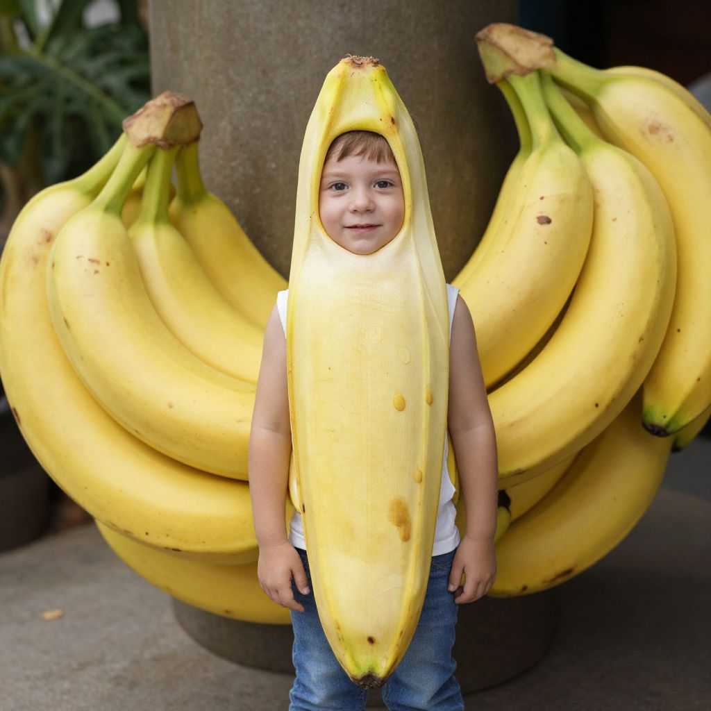 Photograph of a young boy with fair skin and light brown hair, wearing a yellow banana costume with the peel hood up over his head. He has blue eyes and a slight smile. The costume covers his upper body, and he is dressed in a white sleeveless shirt and blue jeans. Behind him, there is a large bunch of ripe yellow bananas with green stems, placed against a tall, gray concrete pillar. The background includes some blurred greenery to the left. The image has a playful and whimsical feel.