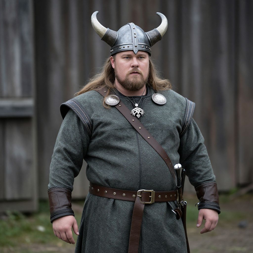 Photograph of a large, bearded man with long brown hair, wearing a Viking helmet with horns, dark green tunic, and brown belt,