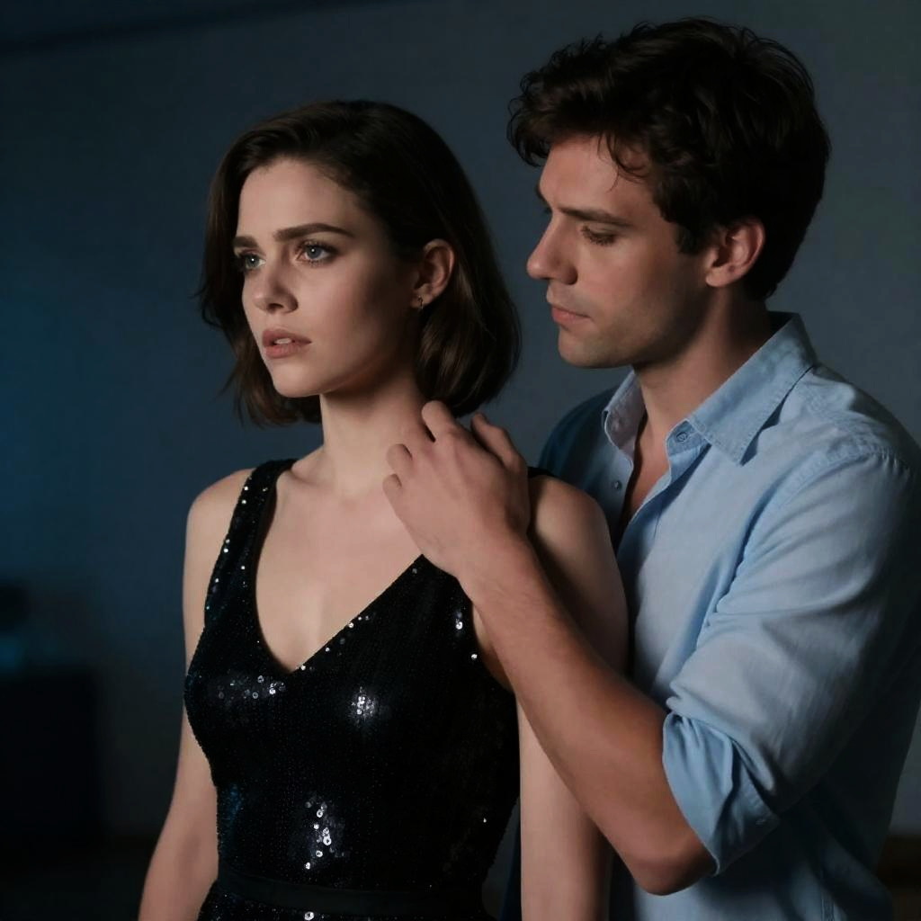 Photograph of a woman with short brown hair, wearing a black sequin dress, and a man with brown hair, wearing a light blue shirt, standing close in a dimly lit, blue-hued background. Man's hand touches woman's neck. Woman's expression is intense, looking to the side.