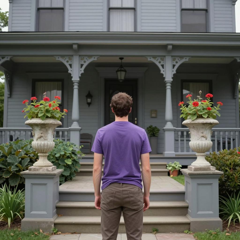 Nighttime photograph of a dark, ominous scene. Silhouetted figure stands on the left, facing a large, dimly lit, brick mansion with two lit windows and two shadowy figures near the entrance.