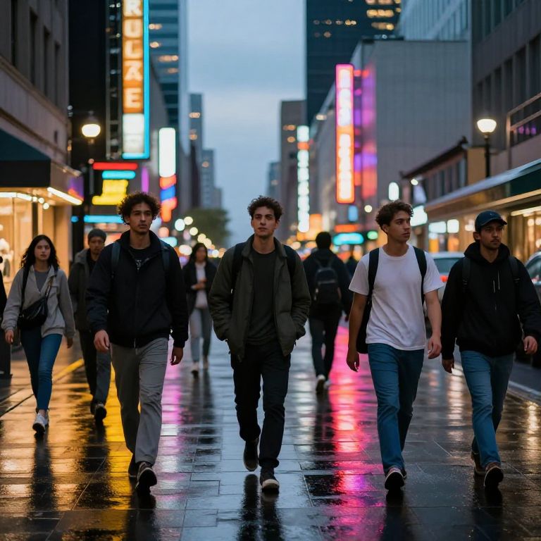 Photograph of a bustling urban street at dusk, with wet, reflective pavement from recent rain. Five young people walk down the center, four males and one female, all casually dressed in jeans and jackets. Neon lights from tall buildings in the background create vibrant pink, blue, and orange reflections on the ground. The sky is a deepening blue, and the street is lined with illuminated storefronts. The group's expressions are neutral, and they appear focused on walking. The overall mood is energetic and modern, capturing the essence of a city nightlife scene.