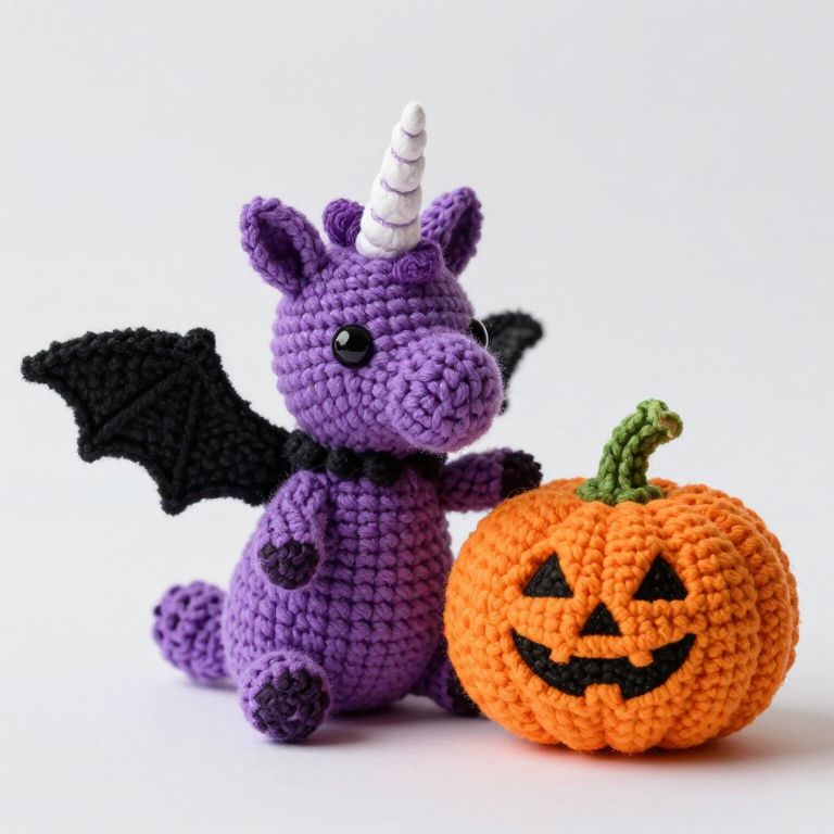 Crafted with vibrant yarn, a whimsical purple bat with black wings and a unicorn horn sits beside an orange pumpkin with a green stem and a mischievous face, showcasing charming Halloween-themed amigurumi creations.