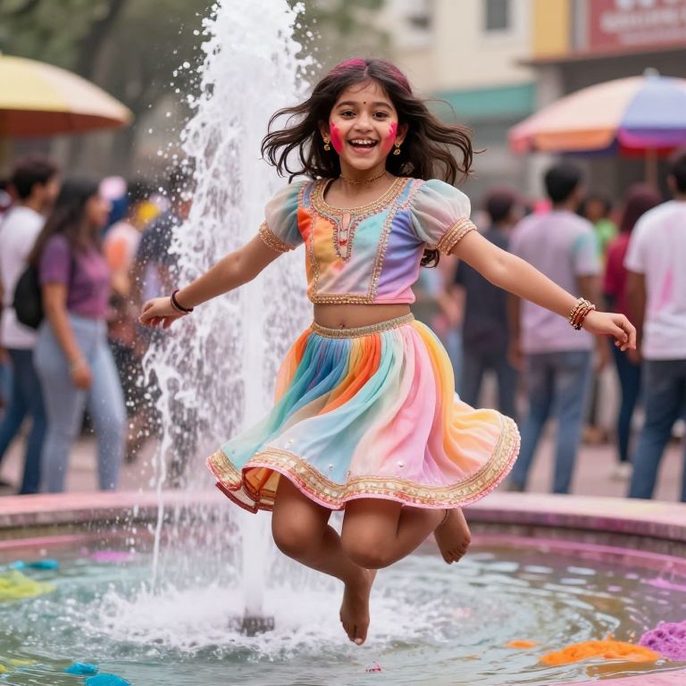 A playful teenager with dark eyes and a freckle-covered nose dressed in a festive holi western dress with a mix of traditional Indian and western elements — such as a fitted top with a flowing hem and pastel gradient hues — laughing while jumping into a color-filled fountain in a bustling urban Holi event.