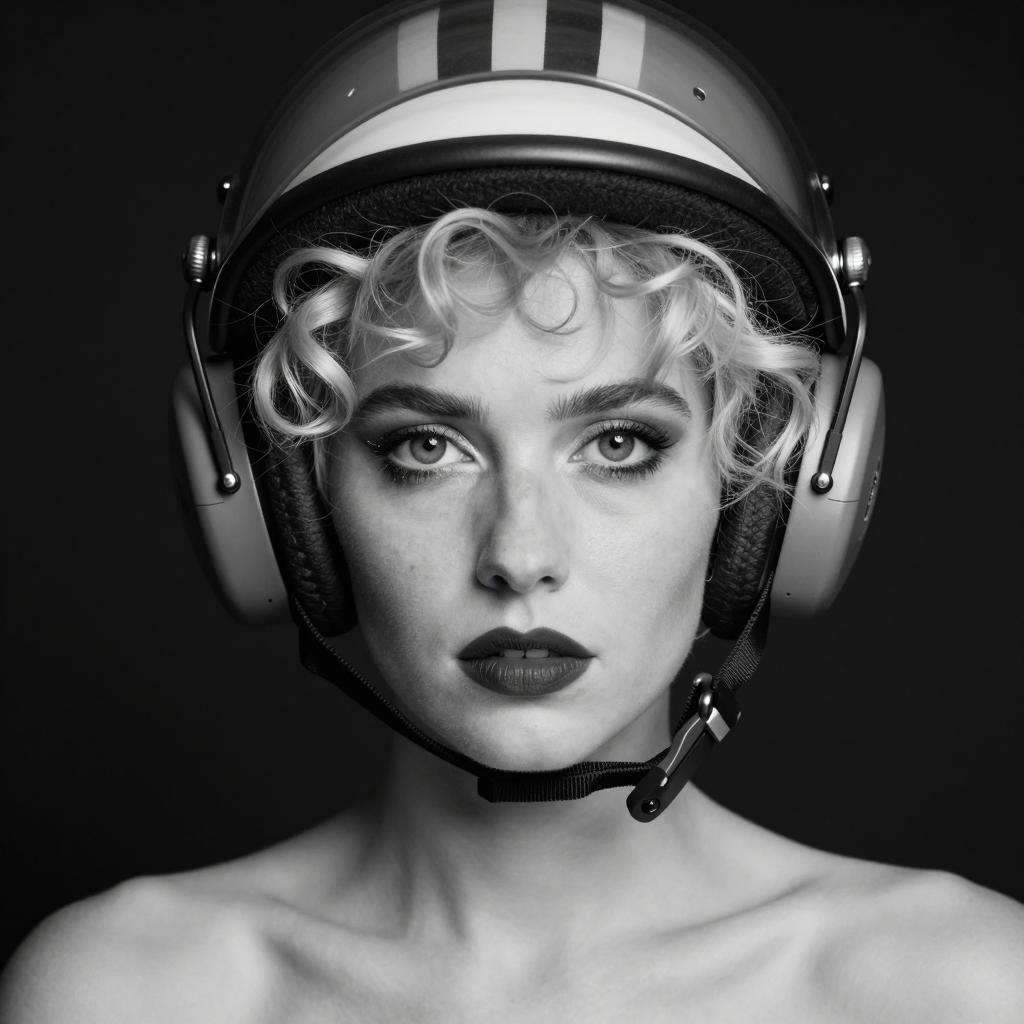 Black and white photograph of a woman with short, curly blonde hair wearing a helmet with large, round earpieces. Her intense, wide eyes and dark lipstick contrast with her pale face. She gazes directly at the camera. Background is completely black. Upper body visible, no clothing.