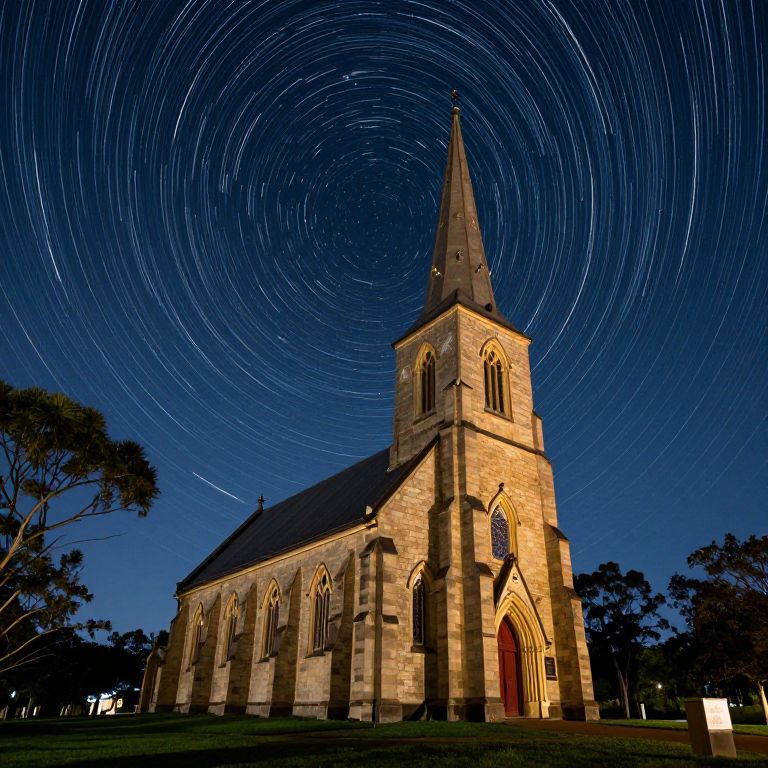 Star trails at Ravenswood Church, QLD (by Cameron Laird).