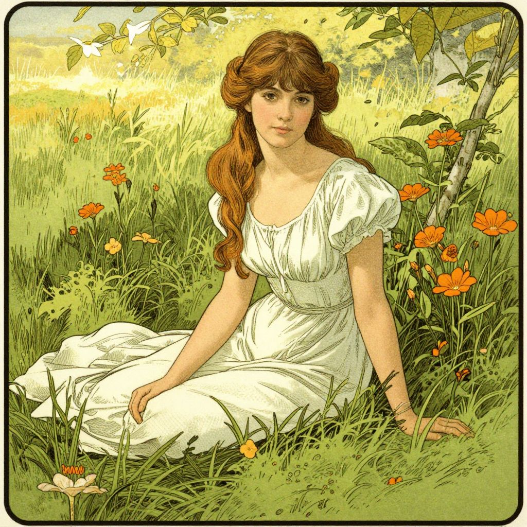 A beautifully rendered Edmund Dulac-style illustration depicts a serene young woman sitting gracefully in a lush, sunlit meadow, surrounded by vibrant greenery and dotted with delicate orange flowers, evoking a timeless, vintage charm through its detailed linework and warm color palette.