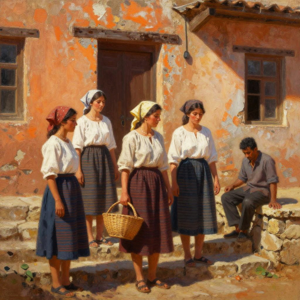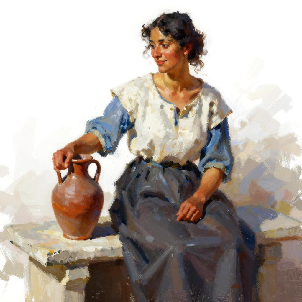 This is a digital painting of a woman with olive skin and dark hair, wearing a white blouse, blue sleeves, and a dark gray skirt. She's sitting on a stone bench, holding a large brown clay jug on her right. She's looking to the left with a slight smile. The background is a simple white wash, highlighting her figure. The style is impressionistic with bold, expressive brushstrokes.