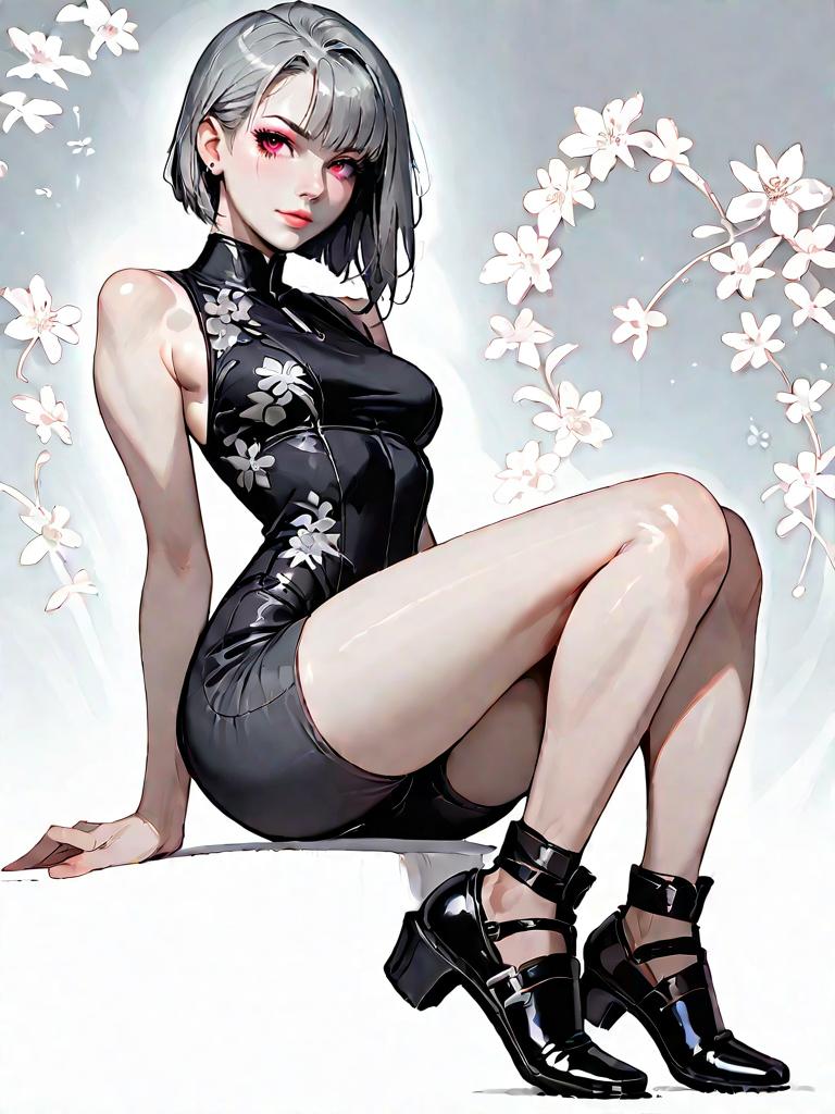 1girl, source_comics, realistic face, full body shot, Woman, casual chic, fitted short-sleeve bodysuit with a floral pattern in red, black, and gray tones, scoop neckline, brief-cut leg opening, paired with no visible accessories, studio background with a gradient from dark to light gray.