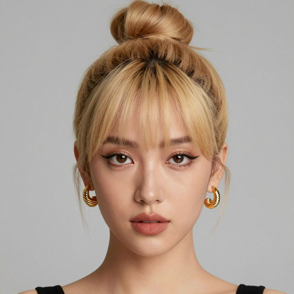 Blonde woman with long hair, light skin, and intense gaze. She has dark, winged eyeliner, thick eyebrows, and full lips. Her right hand touches her lower lip with long, black, pointed nails. She wears a black strap top. The background is plain and light-colored. Close-up portrait.