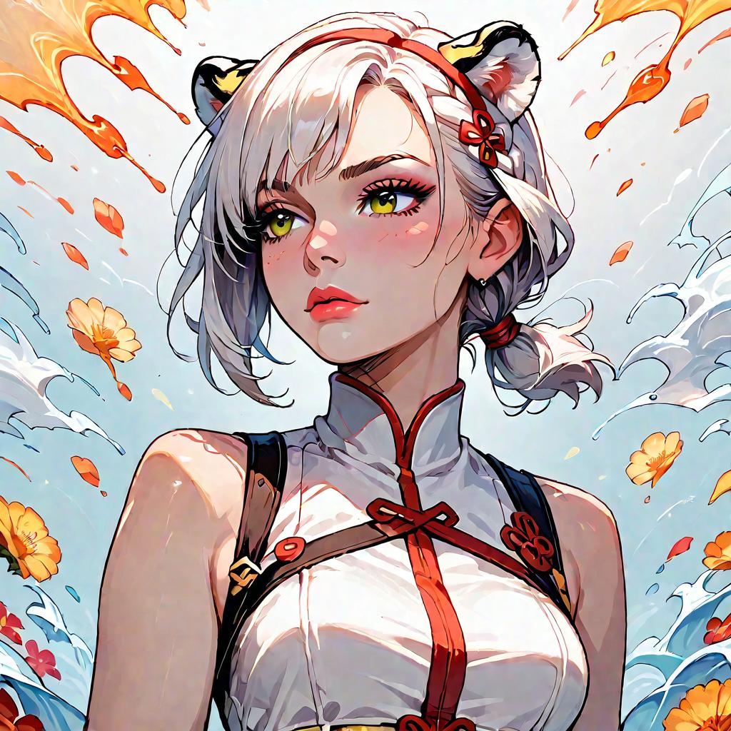 (score_9, score_8_up, score_7_up), erotic pose, white hair, short hair, braided ponytail, short ponytail, upper_body, face_focus, tiger ears, yellow eyes, beautiful_eyes, liquid_background, portrait, hairpin, wind, expressionless, multicolour chest pleated skirt, chinese, red with white waistband, miraa \(chikurin\)