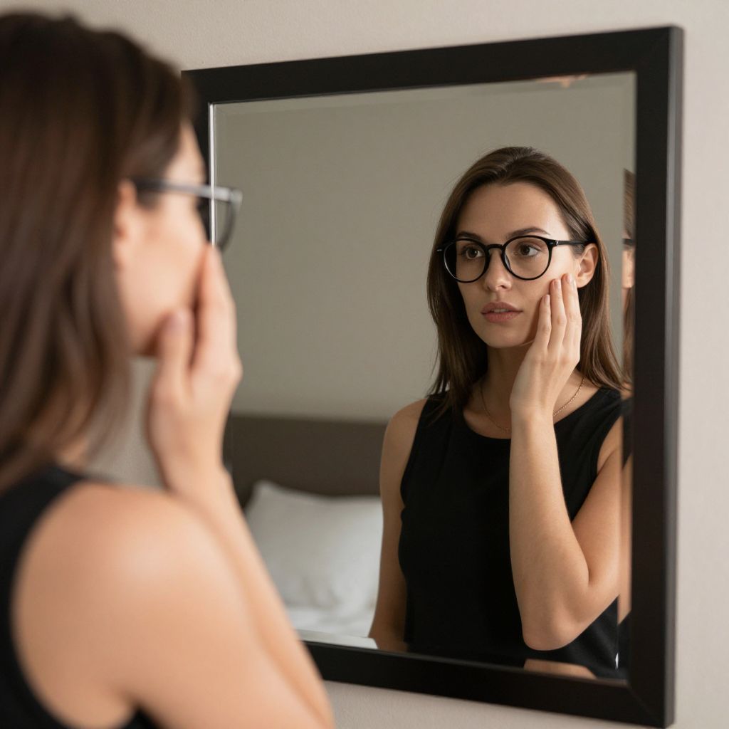 Woman examining her reflection in a sleek, rectangular mirror while adjusting her glasses, her hand gently touching her cheek as she stands in a softly lit room.