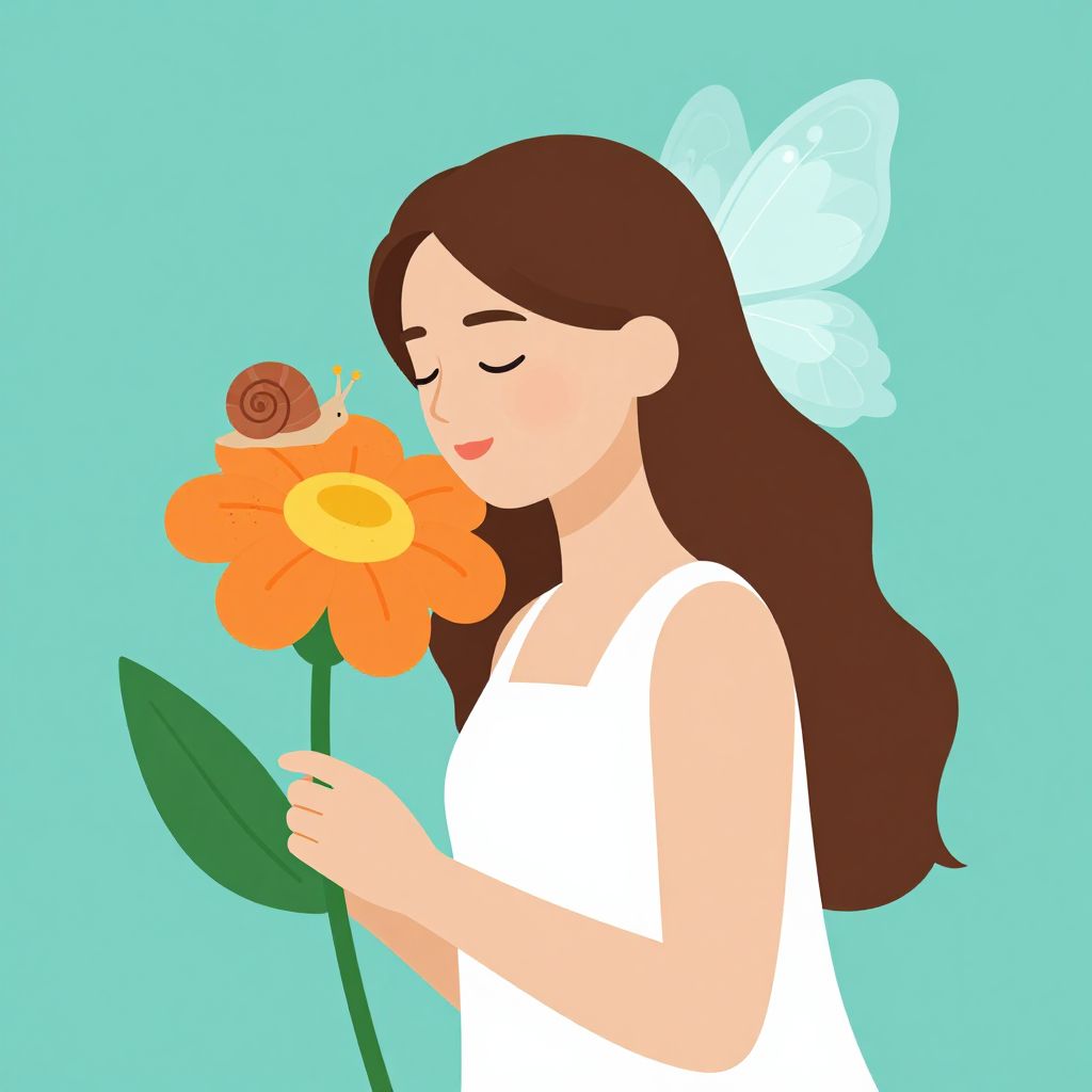 Digital illustration of a fair-skinned woman with long brown hair, wearing a white sleeveless dress and a light blue butterfly hair accessory. She holds an orange flower with a green leaf, and a small brown snail is on the flower's petals. The background is a solid light blue. The woman has closed eyes and a gentle smile, giving a serene and peaceful vibe. The style is simplistic and cartoon-like, with flat colors and clean lines.