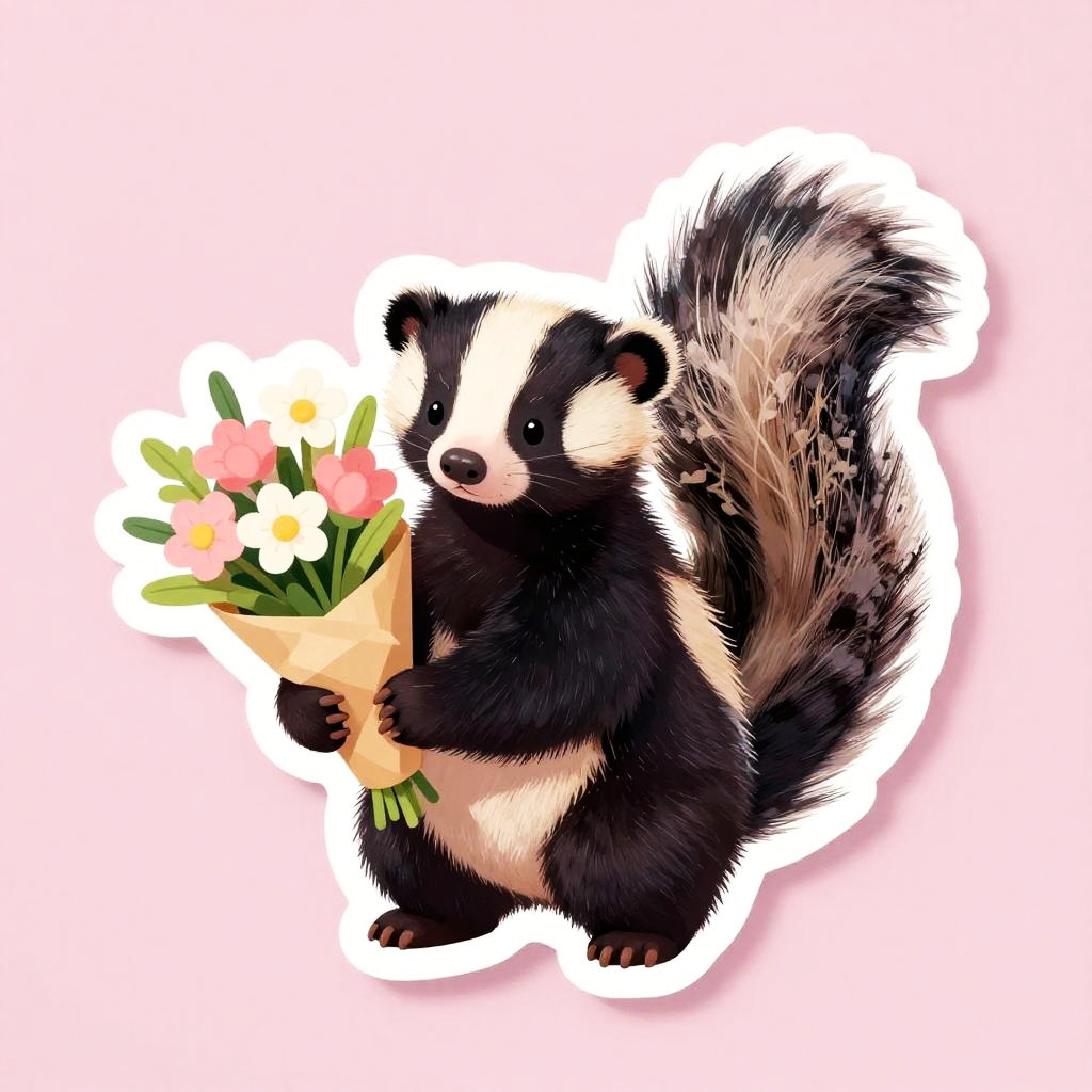 Cut sticker depicting the skunk holding the flower bouquet, a solid pink background
