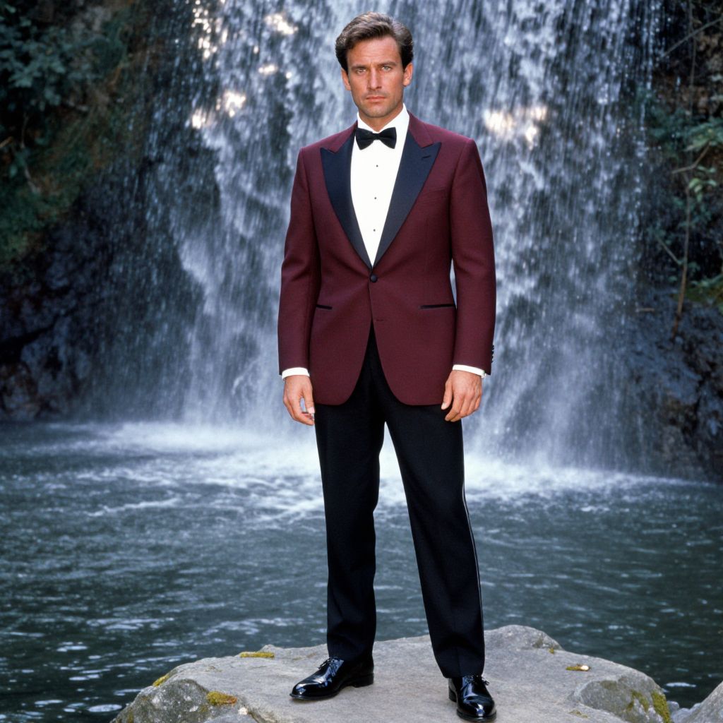 "a man, burgundy silk shawl collar tuxedo, white poplin dress shirt, black satin bow tie, fitted black trousers, glossy black monk strap shoes, standing by a gentle cascading waterfall, ektachrome film stock, confident expression, soft sunlight filtering through trees. Man has masculine face and piercing eyes"