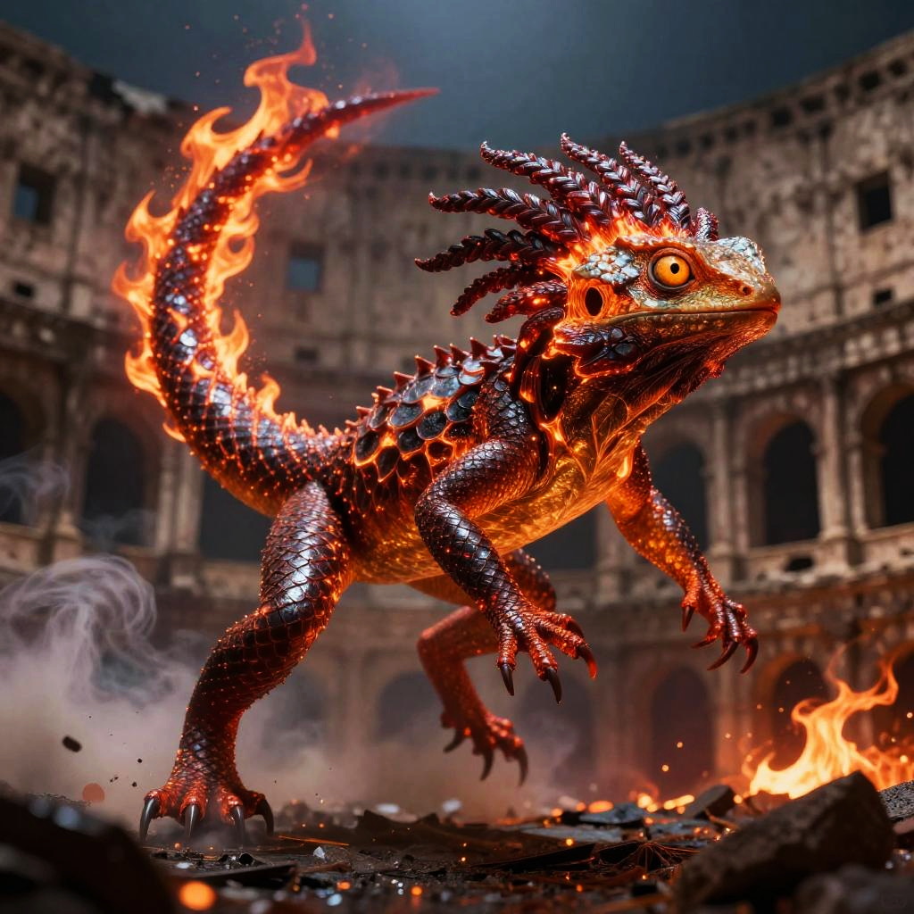 Ember-lizard creature with braided molten lava hair and reflective scales, spinning mid-air with a blazing tail sweep, ruined ancient coliseum surrounded by ember smoke, action shot, skin pores, very dark lighting, heavy shadows, detailed face, vibrant, photorealistic, dramatic, sharp focus, 8k, (intricate:1.4), decadent, (highly detailed:1.4), digital painting, concept art, octane render, artstation, smooth illustration, global illumination, studio light, volumetric light, atmospheric fog, particles floating, embers, wet surfaces, rim light, depth of field