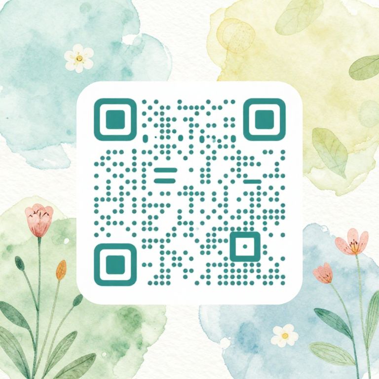Watercolor floral background with a QR code in the center, featuring teal dots and squares, surrounded by pink and yellow flowers.