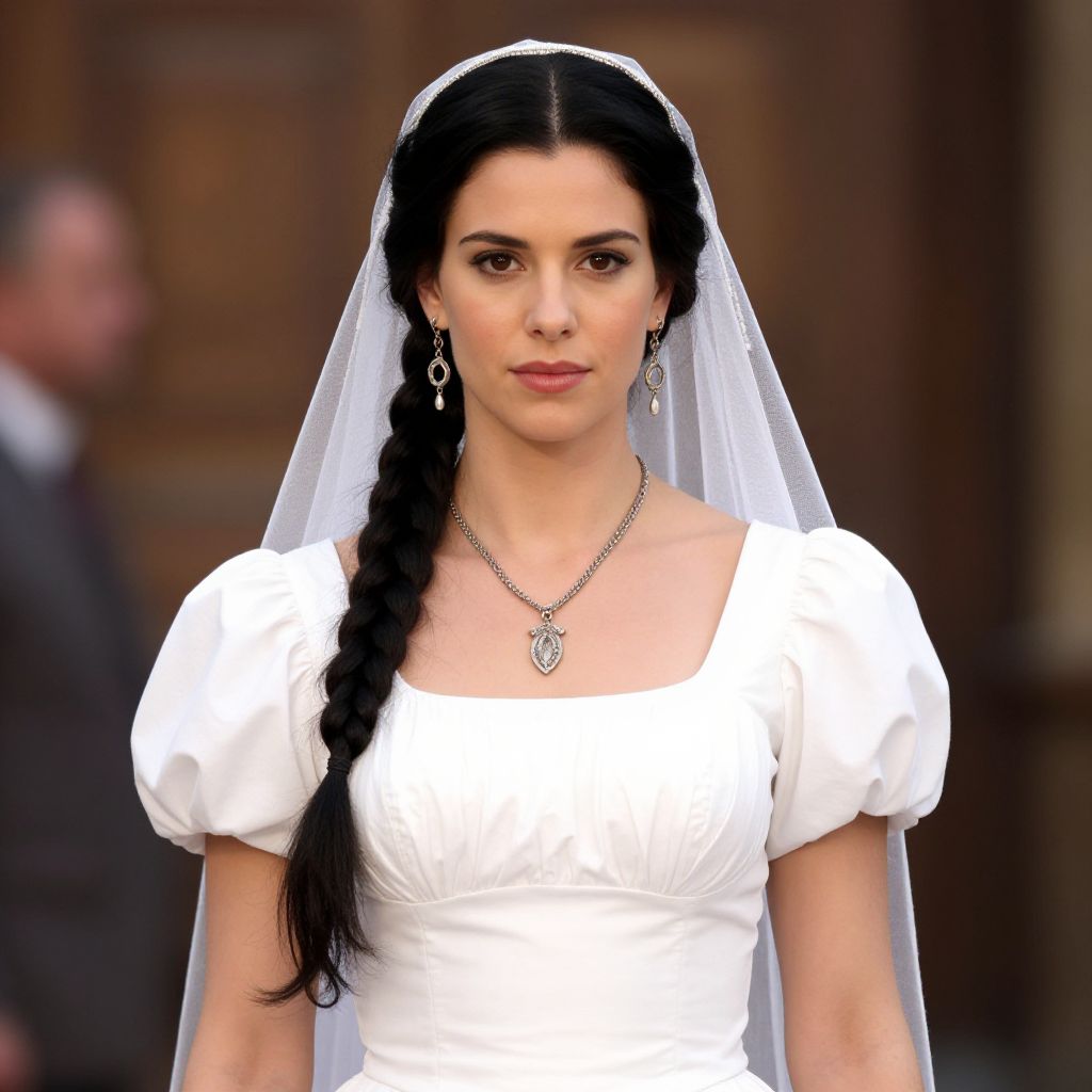 Lady godiva costume, 1girl, solo, jewelry, veil, dress, blurry background, looking at viewer, necklace, blurry, earrings, puffy sleeves, braid, upper body, puffy short sleeves, long hair, short sleeves, black hair, realistic, white dress