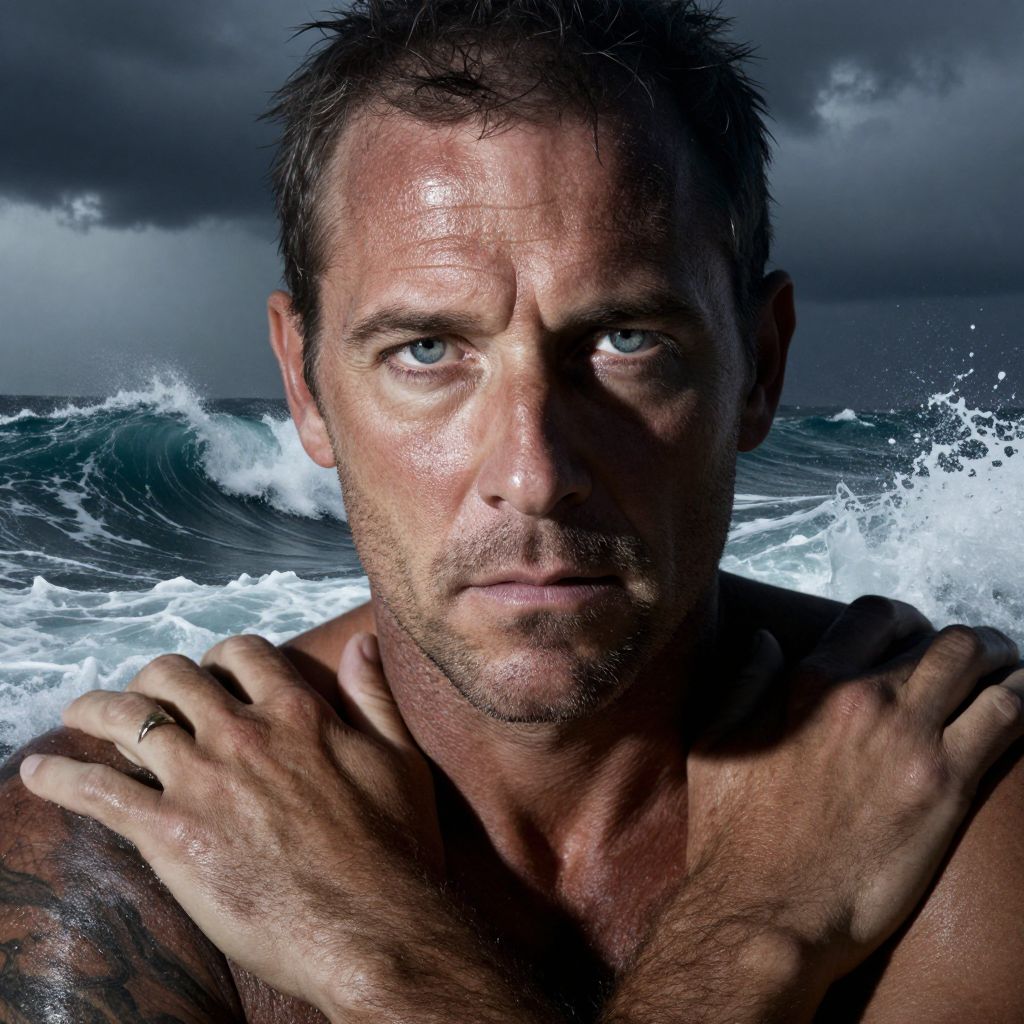 A captivating double exposure portrait showcases a rugged middle-aged man with sun-kissed skin and piercing blue eyes, his expression conveying both weariness and quiet resilience. The mesmerizing overlaid image depicts a stormy sea with crashing waves extending from the man's gaze, creating a surreal connection between him and nature's untamed power. His weathered hands grasp at the turbulent water as if to tame its wild spirit, while dramatic chiaroscuro lighting casts deep shadows that accentuate the rugged texture of his skin, emphasizing his strength and depth of character. The stormy sea behind him symbolizes an eternal struggle against life's tempestuous challenges.