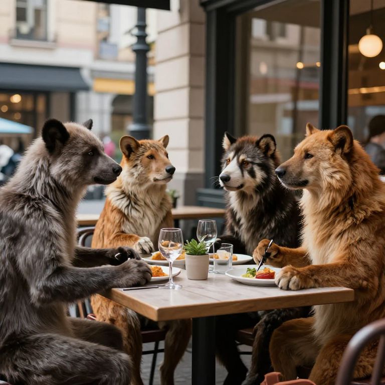 Realistic anthropomorphic animals dining at an outdoor café, assorted species interacting, realistic fur and skin textures, stylish urban setting, dynamic natural lighting, ultra-realistic rendering