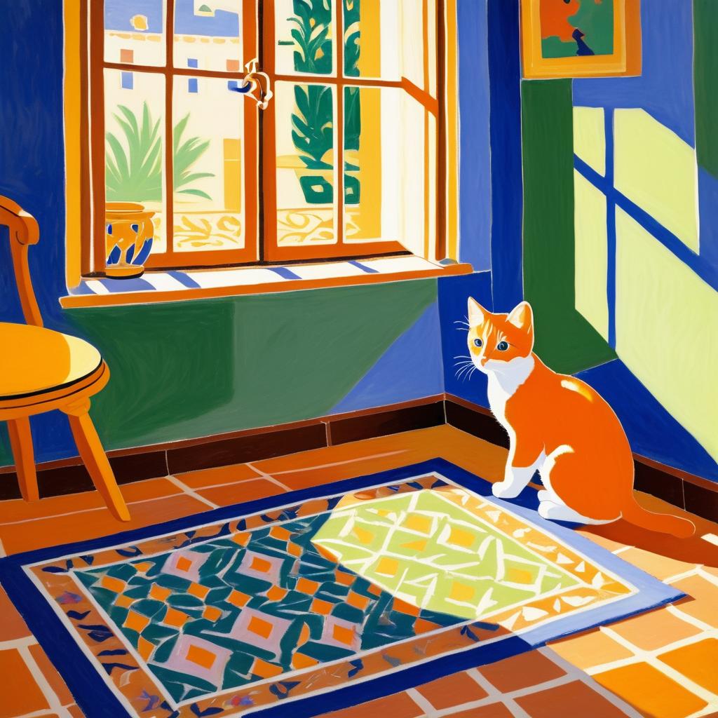 Painting in the style of Henri Matisse depicting a black and white kitten sitting on an orange tiled floor inside a cozy room with vibrant colored walls, open yellow doors, green vases, and a window with potted plants. The image features Renaissance-style lighting with detailed shadows and bright, bold colors.
