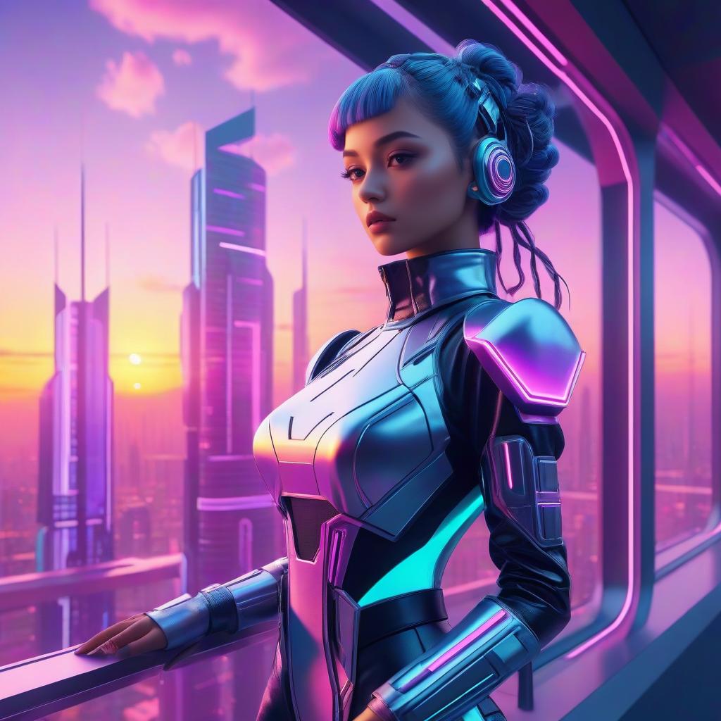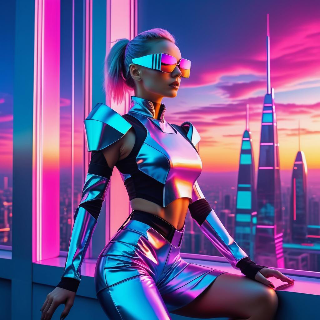 A fashionable cyber model posing in a futuristic outfit, retro future city outside a window, vaporwave wallpaper, vivid sunset, dreamy, extremely detailed, ultra-high resolution, rendered in Cinema 4D