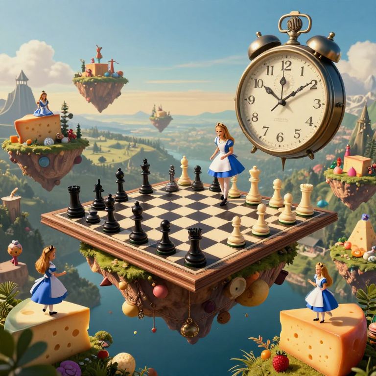 Envision a dreamlike landscape where surrealism intertwines with fantasy. In this whimsical realm, instead of traditional timepieces, floating islands crafted from diverse cheeses take the place of melting clocks. These cheese islands are vibrant ecosystems teeming with peculiar creatures reminiscent of those found in Alice's adventures. A giant, levitating chessboard adds to the fantastical setting as its pieces come alive and engage in playful interactions with the island inhabitants. This aerial view captures the essence of a surreal dreamscape that blends Dali-esque surrealism with Carrollian fantasy, evoking an atmosphere of wonder and curiosity about the bizarre world unfolding before our eyes.