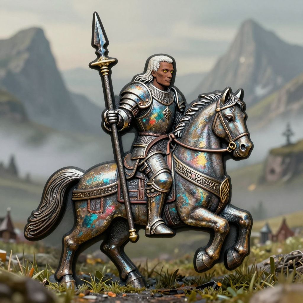 Line art trinket depicting a middle earth, Knight Charging into battle on horseback, wielding a lance and clad in heavy armor, Master, Short, Thin, Square Face, Dark Skin, White Hair, yellow Eyes, Straight Nose, Thin Lips, Prominent Chin, Garibaldi, Medium, Crew Cut, Misty mountains towering over a vast, misty valley, Tolkien Shuzo Oshimi, natural, shimmering, vibrant, gothic, rpg, 1400ad, ultra detailed, detailed, immersive, reminiscent of high fantasy RPG games, HD, masterpiece, best quality, hyper detailed, super realistic, perfect face, perfect hands, award-winning, professional, breathtaking, linquiverafancy Meadowrowdy weathergrunge style . textured, distressed, vintage, edgy, punk rock vibe, dirty