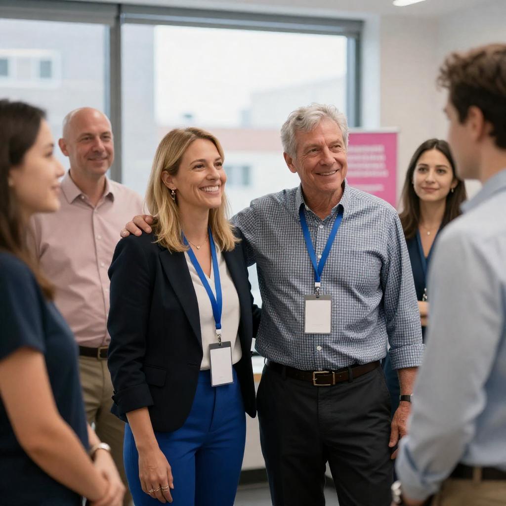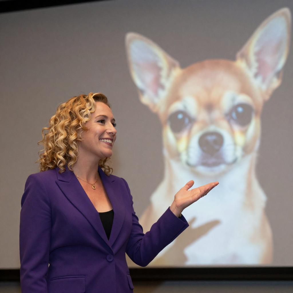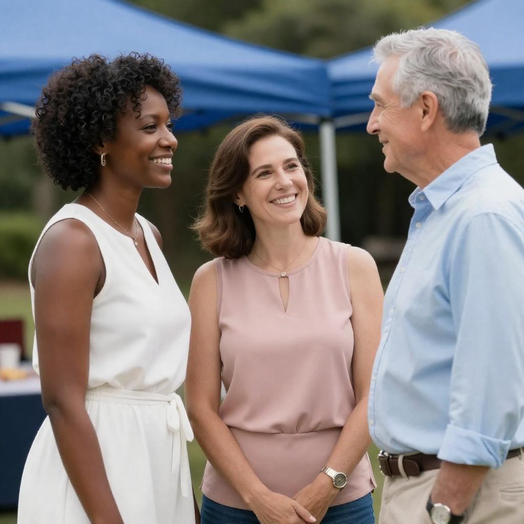 Photograph of two women in a convention hall. The woman on the left has curly brown hair, wears a sleeveless burgundy dress, and faces the woman on the right. The woman on the right has blonde hair in a bun, wears a blue blouse and pink skirt, and gestures while speaking. A table with a banner and balloons is in the background.