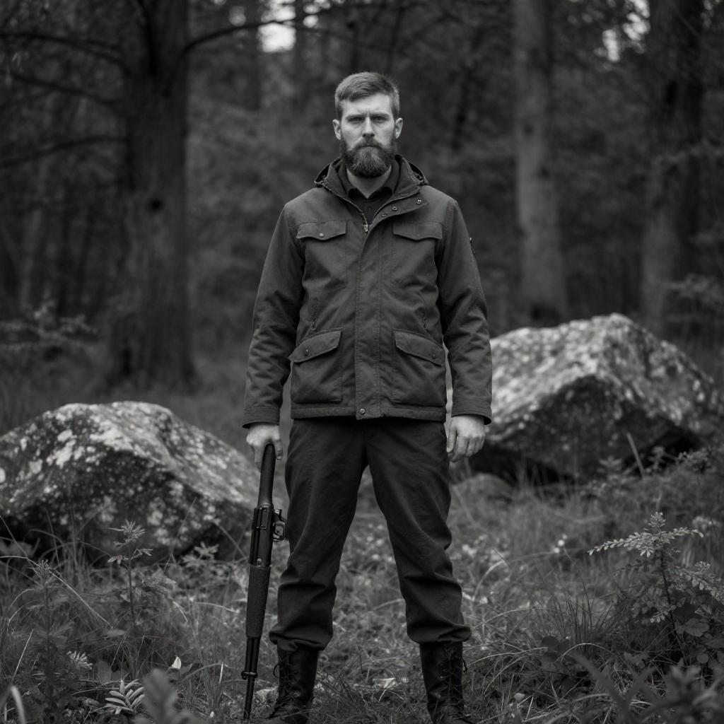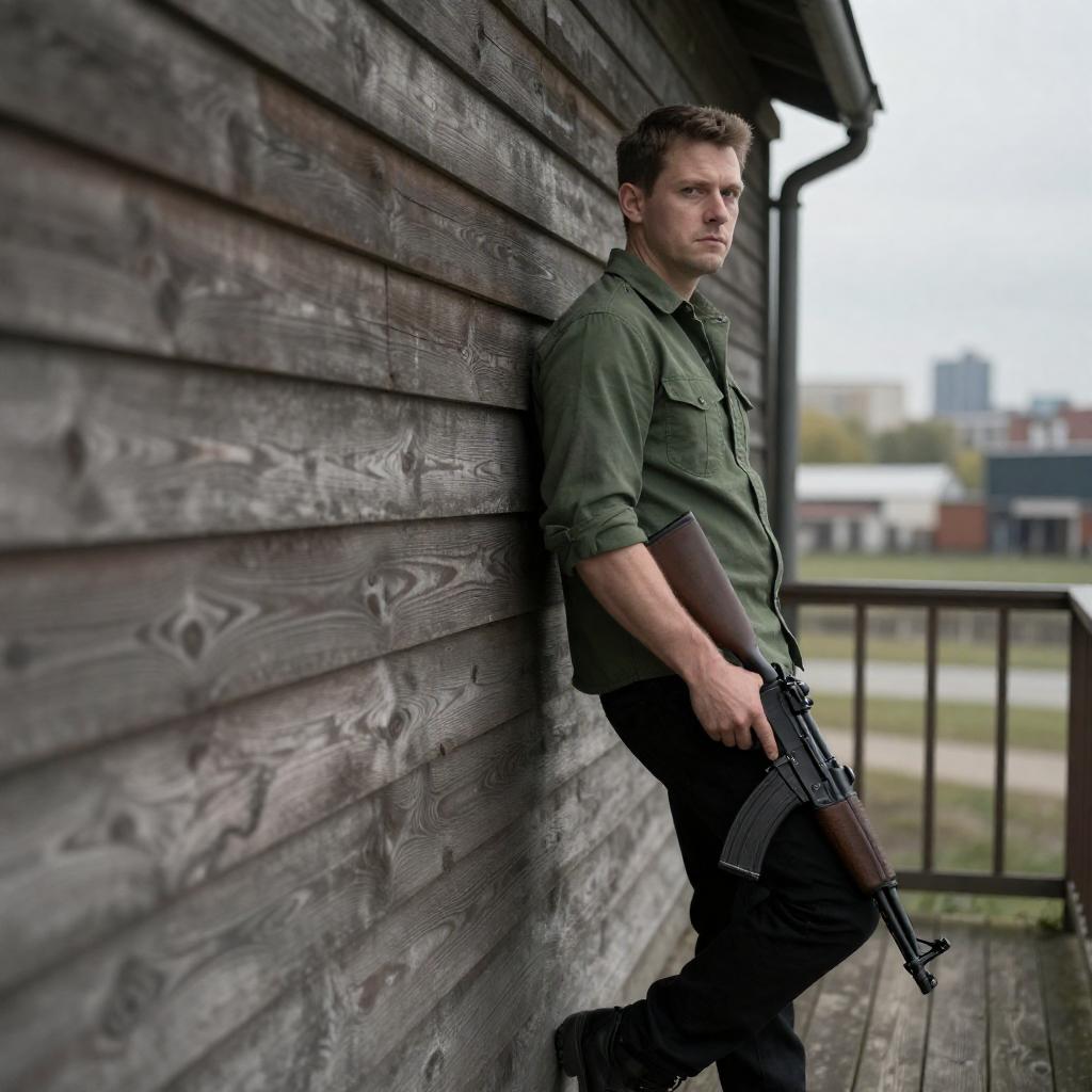 Photograph of a man leaning against a weathered wooden building. He has light skin, short brown hair, wears a green shirt and black pants, and holds a black rifle. Background shows a distant cityscape and industrial buildings. Man's expression is serious. Building has horizontal wooden planks and a metal rail.