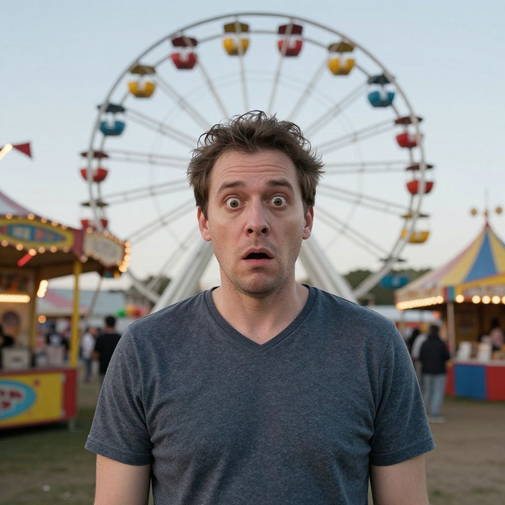 Photograph of a surprised-looking man with short, messy brown hair in a gray V-neck shirt, standing in front of a colorful Ferris wheel at