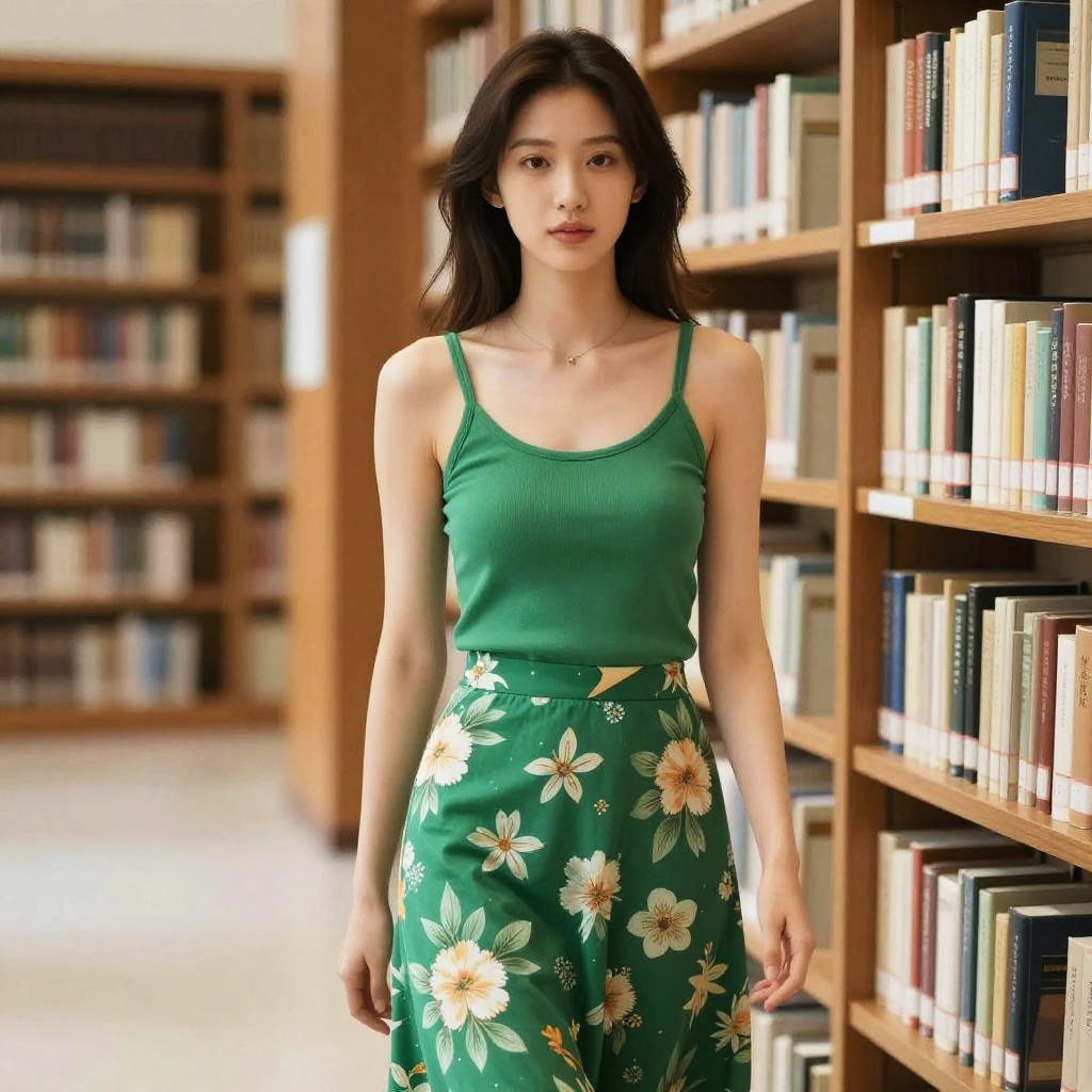 Best quality, masterpiece, ultra high res, (photorealistic:1.4), raw photo, 1girl, Green tank top with floral maxi skirt, library