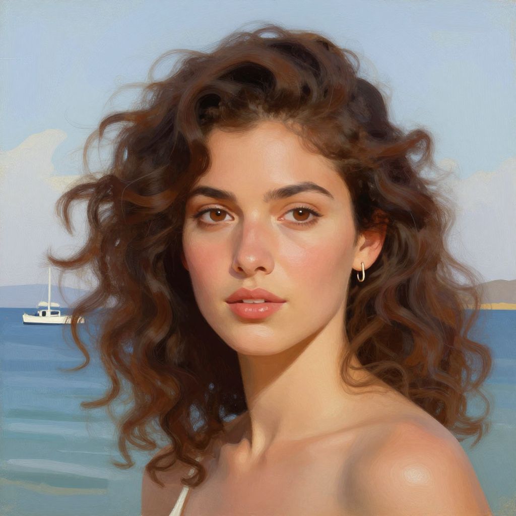 Digital painting of a young woman with pale skin and curly, chestnut-brown hair. She has large, expressive brown eyes, full lips, and wears small, dangling earrings. Her expression is neutral, with a slight hint of curiosity. She is dressed in a light-colored top. In the background, there is a calm blue ocean with a white boat floating on the water, under a clear, light blue sky. The painting style is realistic with a soft, painterly texture.