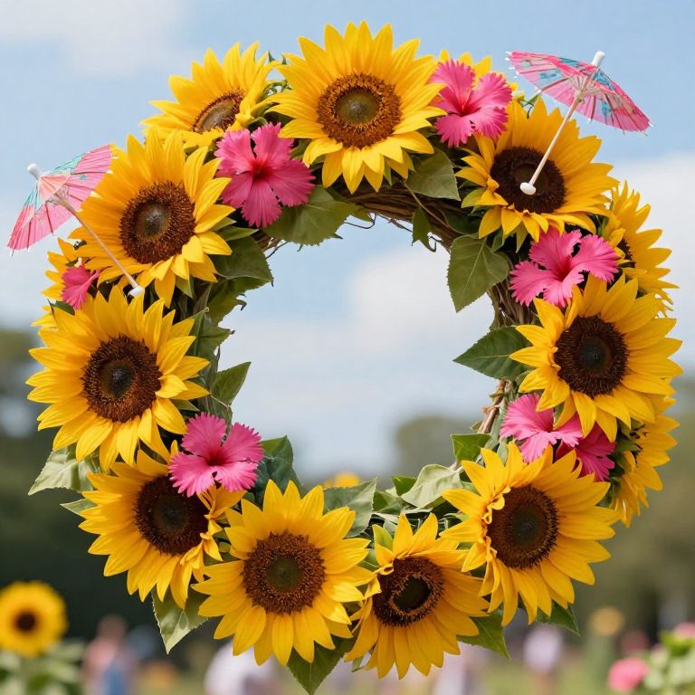 A whimsical summer wreath bursts with surreal charm, adorned with vibrant sunflowers, bold pink blooms, and cocktail umbrellas that defy gravity, creating a fantastical portal into a joyous, dreamlike celebration.