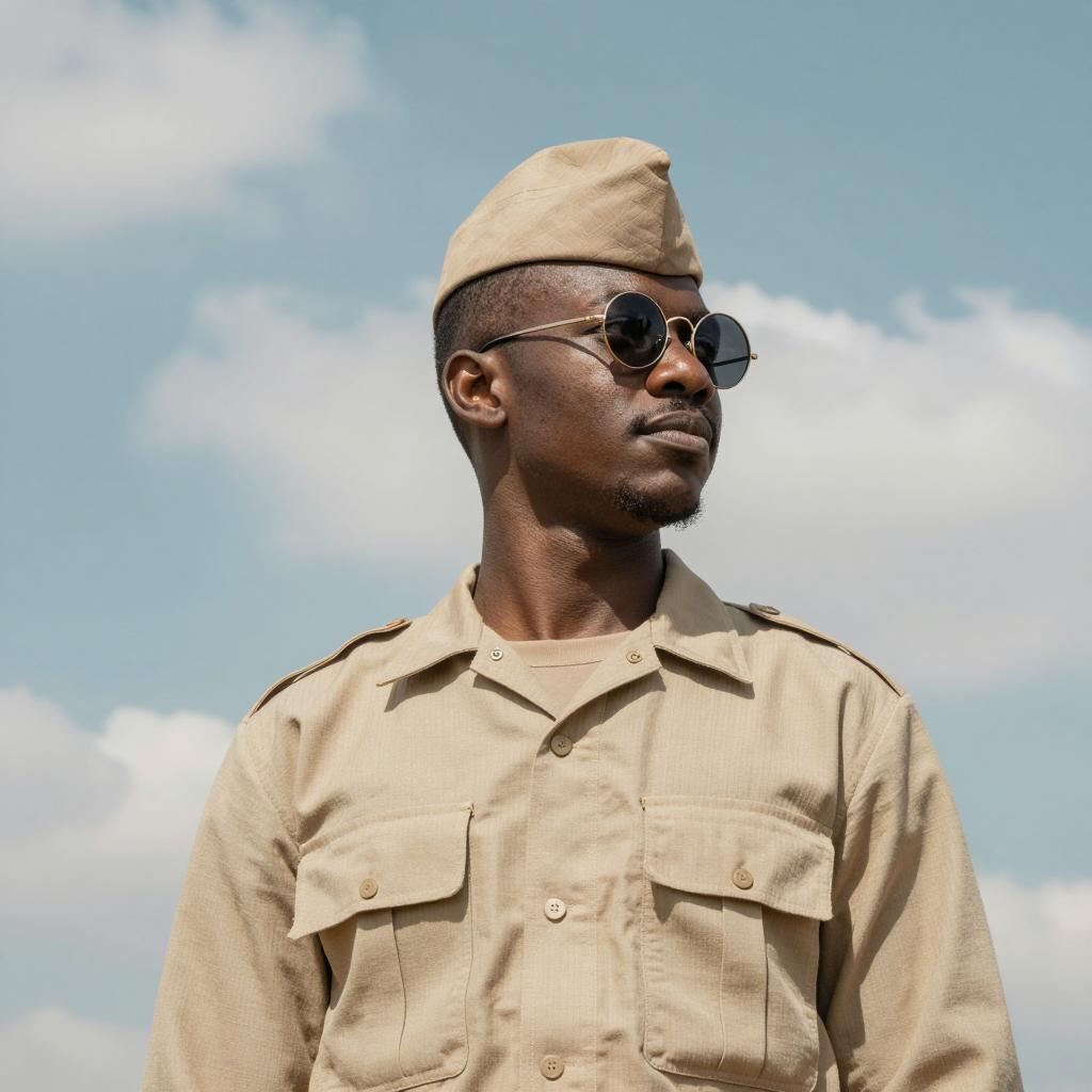 A photograph of a Black man in a beige military uniform and cap, wearing round sunglasses, looking to the right. He stands against a sky with white clouds and blue-green hues. His face is in profile, with a calm expression. The uniform has two chest pockets and a buttoned collar.