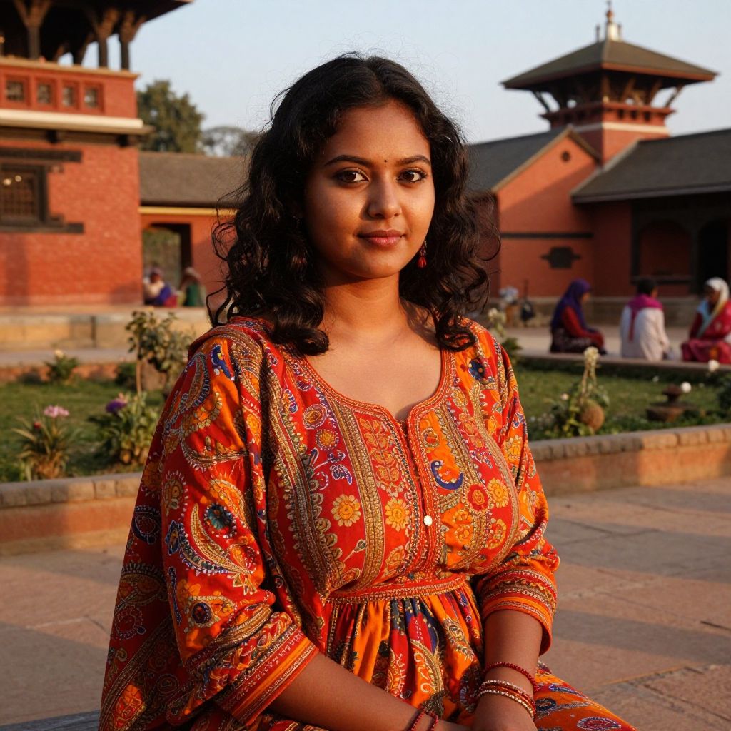 A realistic photography of a young Nepali woman in her late 20s with warm brown skin, deep brown eyes, and natural curly black hair wearing a traditional patola chaniya choli costume, vividly patterned with handwoven paisley and floral motifs in bright red, orange, and gold, sitting in a vibrant traditional courtyard of a rural Newar village during sunset, soft golden light casting long shadows, background featuring terracotta walls, terraced gardens, and women weaving in the distance. The woman has big tits and cute face