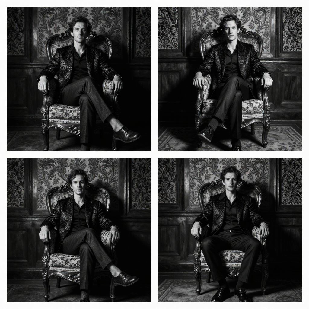 This is a black-and-white photograph collage featuring four portraits of a man seated in an ornate, vintage armchair with intricate floral patterns on the upholstery. The man, with wavy dark hair and a serious expression, wears a dark, patterned jacket over a black shirt and black trousers, paired with black shoes. He is positioned in a slightly relaxed manner, with one arm resting on the armchair's armrest and the other on his thigh, and his legs crossed. The background showcases elaborate, dark wood-paneled walls with detailed carvings. The image has a high-contrast, dramatic style, emphasizing the textures and shadows. The collage is arranged in a 2x2 grid format.