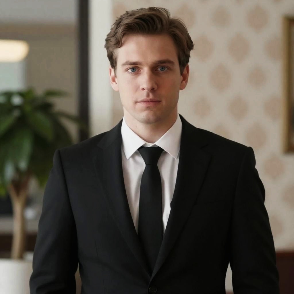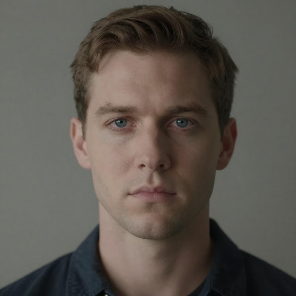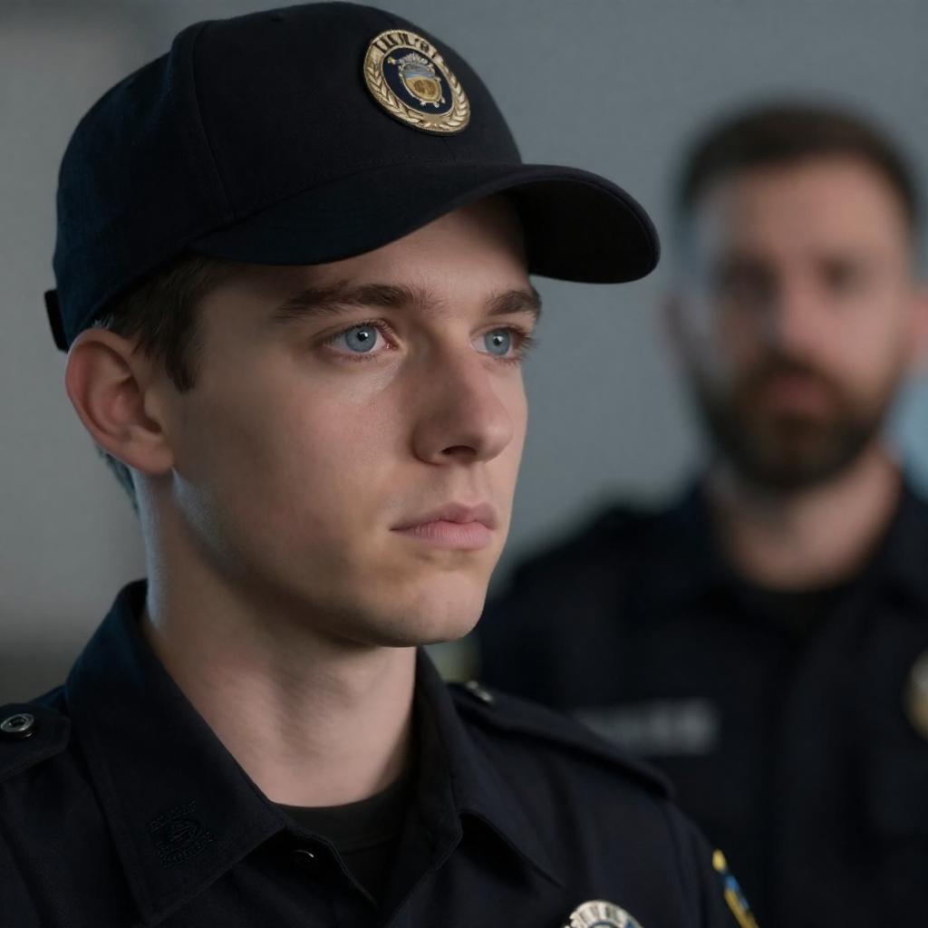 Photograph of a Caucasian man with short brown hair, dressed in a white shirt and striped tie, wearing suspenders, looking serious. Blurred police car lights in the background. Nighttime setting. Man's face slightly illuminated by police lights.
