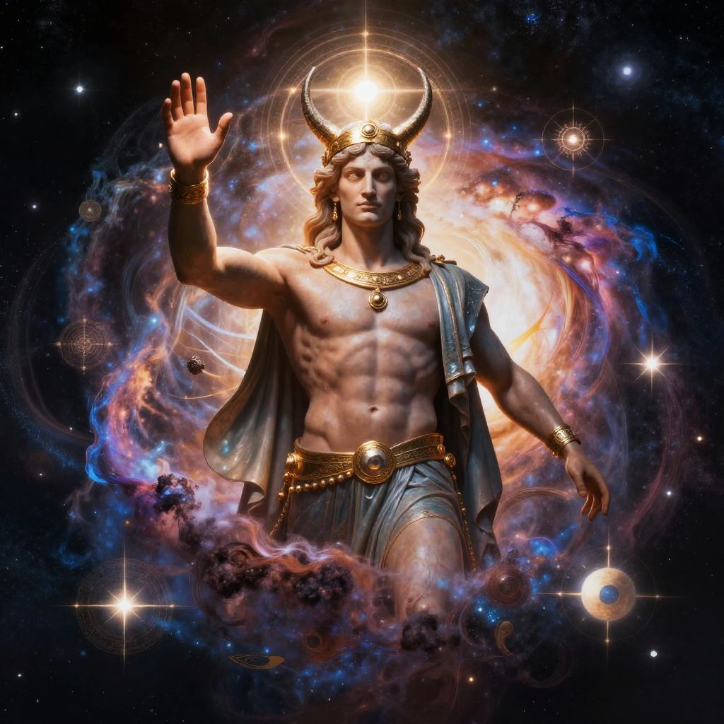 A detailed illustration of Coeus, the Titan of foresight, shown emerging from a galaxy with eyes radiating knowledge and insight, surrounded by celestial symbols and an aura of mystic light, blending mythology and cosmic energy in a dynamic composition.
